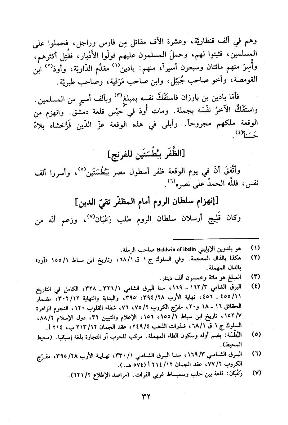 [6] البرق الشامي 3/ 169، سنا البرق الشامي 1/ 330، نهاية الأرب 28/ 395، مفرّج الكروب 2/ 77، عقد الجمان 12/ 214 أ (574 هـ.) .