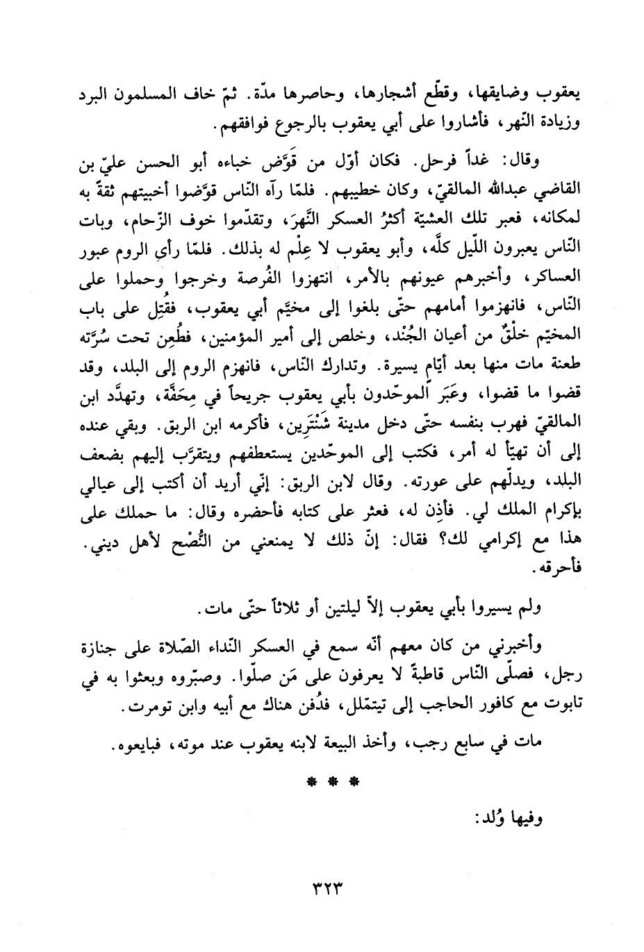 وقال: غدا فرحل. فكان أوّل من قَوض خباءه أَبُو الْحَسَن عليّ بْن القاضي عَبْد اللَّه المالقيّ، وكان خطيبهم. فلمّا رآه النّاس قوّضوا أخبيتهم ثقة به لمكانه، فعبر تلك العشيّة أكثرُ العسكر النهرَ، وتقدّموا خوف الزّحام، وبات النّاس يعبرون اللّيل كلّه، وأبو يعقوب لَا عِلم لَهُ بذلك. فلمّا رَأَى الروم عبور العساكر، وأخبرهم عيونهم بالأمر، انتهزوا الفُرصة وخرجوا وحملوا على النّاس، فانهزموا أمامهم حتّى بلغوا إلى مخيّم أَبِي يعقوب، فَقُتِلَ على باب المخيّم خلقٌ من أعيان الْجُنْد، وخلص إلى أمير المؤمنين، فطُعن تحت سُرته طعنة مات منها بعد أيّام يسيرة. وتدارك النّاس، فانهزم الروم إلى البلد، وقد قضوا ما قضوا، وعَبَر الموحّدون بأبي يعقوب جريحا فِي مَحَفة، وتهدّد ابْن المالقيّ فهرب بنفسه حتّى دخل مدينة شَنْتَرِين، فأكرمه ابْن الربق. وبقي عنده إلى أن تهيّأ لَهُ أمر، فكتب إلى الموحّدين يستعطفهم ويتقرّب إليهم بضعف البلد، ويدلّهم على عورته. وقال لابن الربق: إنّي أريد أن أكتب إلى عيالي بإكرام الملك لي. فإذِن لَهُ، فعثر على كتابه فأحضره وقال: ما حملك على هذا مع إكرامي لك؟ فقال: إنّ ذلك لَا يمنعني من النّصح لأهل ديني.