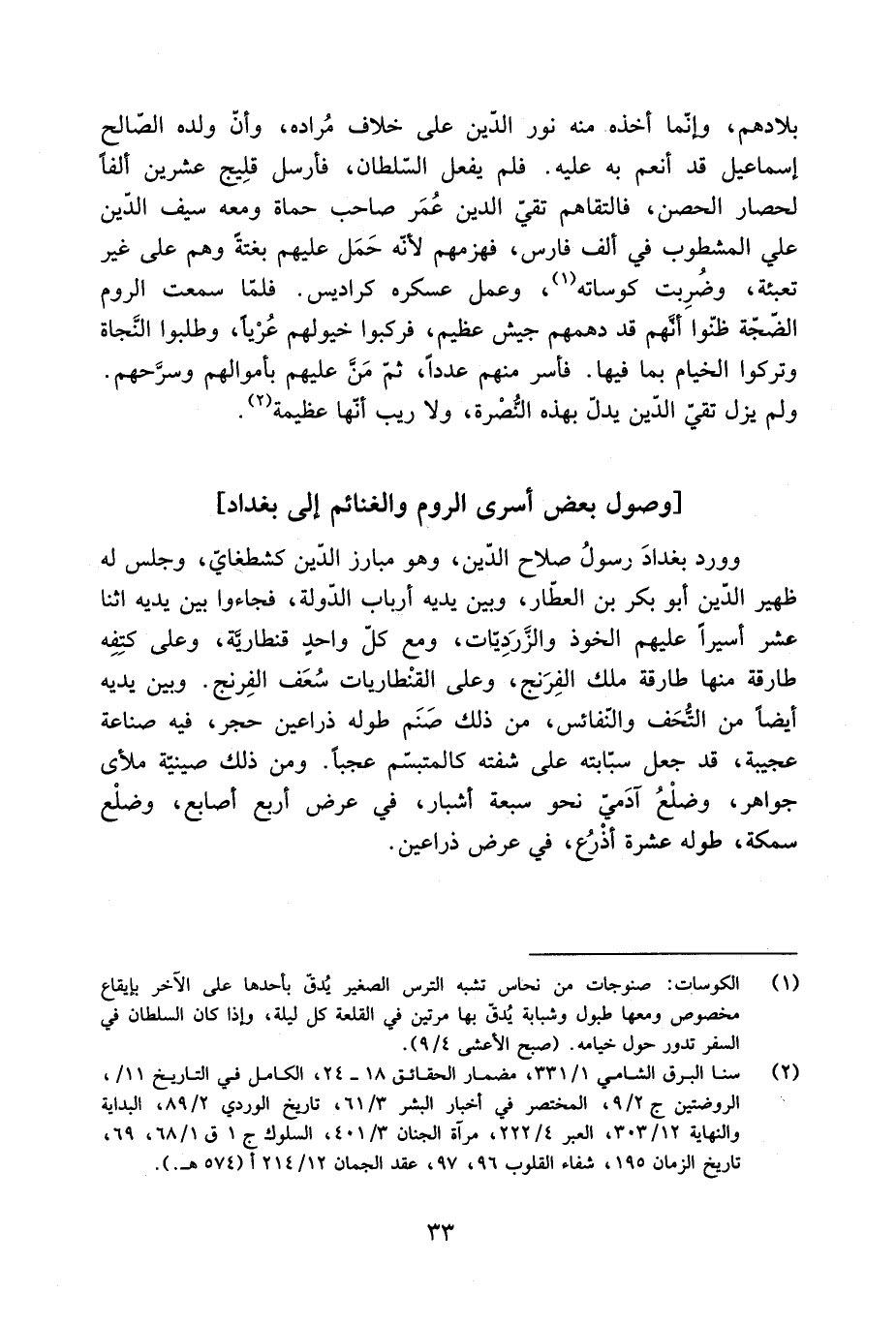 [2] سنا البرق الشامي 1/ 331، مضمار الحقائق 18- 24، الكامل في التاريخ 11/، الروضتين ج 2/ 9، المختصر في أخبار البشر 3/ 61، تاريخ الوردي 2/ 89، البداية والنهاية 12/ 303، العبر 4/ 222، مرآة الجنان 3/ 401، السلوك ج 1 ق 1/ 68، 69، تاريخ الزمان 195، شفاء القلوب 96، 97، عقد الجمان 12/ 214 أ (574 هـ.) .
