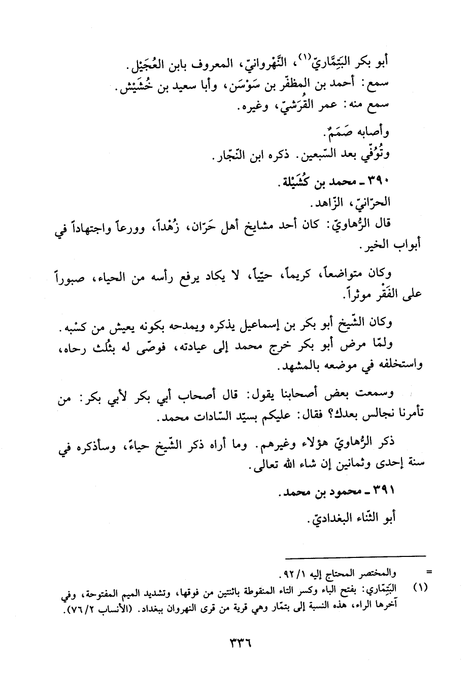 [1] البتمّاري: بفتح الباء وكسر التاء المنقوطة باثنتين من فوقها، وتشديد الميم المفتوحة، وفي آخرها الراء، هذه النسبة إلى بتمّار وهي قرية من قرى النهروان ببغداد. (الأنساب 2/ 76) .