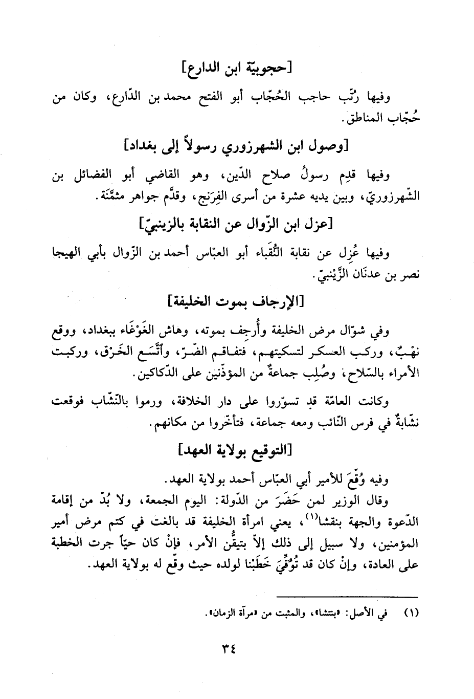 وقال الوزير لمن حَضَرَ من الدّولة: اليوم الجمعة، وَلَا بُد من إقامة الدّعوة والجهة بنقشا [1] ، يعني امْرَأَة الخليفة قد بالغت فِي كتم مرض أمير المؤمنين، وَلَا سبيل إلى ذلك إلَّا بتيقُن الأمر، فإنْ كان حيّا جرت الخطبة على العادة، وإنْ كان قد تُوفيَ خَطَبنا لولده حيث وقّع له بولاية العهد.