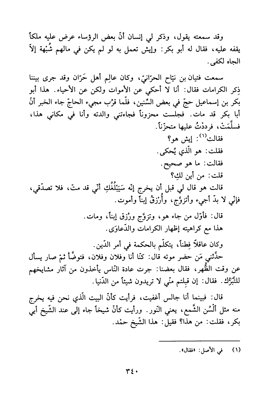 سمعت فتيان بْن نيّاح الحرّانيّ، وكان عالِم أهل حَران وقد جرى بيننا ذِكر الكرامات فقال: أَنَا لَا أحكي عَن الأموات ولكن عَن الأحياء. هذا أَبُو بَكْر بْن إِسْمَاعِيل حجّ فِي بعض السّنين، فلمّا قرُب مجيء الحاجّ جاء الخبر أنّ أَبَا بَكْر قد مات. فجلست محزونا فجاءتني والدته وأنا فِي مكاني هذا، فسلمَتْ، فرددتُ عليها متحزْنًا.