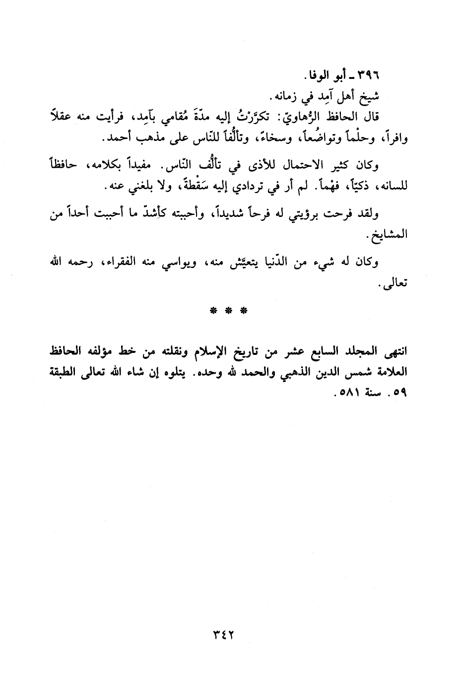 انتهى المجلد السابع عشر من تاريخ الإسلام ونقلته من خط مؤلفه الحافظ العلامة شمس الدين الذهبي والحمد للَّه وحده. يتلوه إن شاء الله تعالى الطبقة 59. سنة 581.