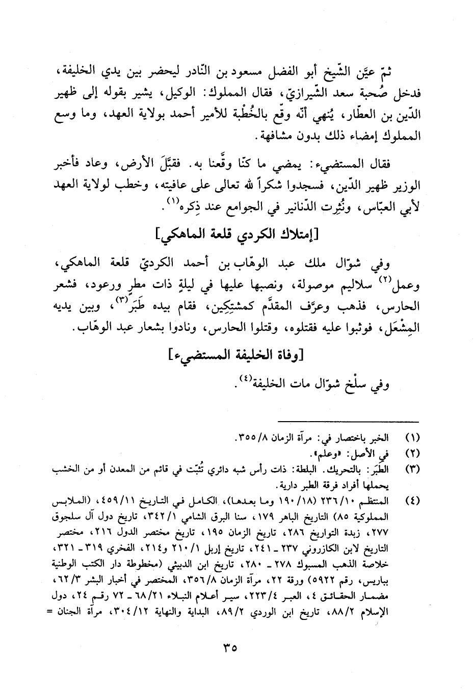 [4] المنتظم 10/ 236 (18/ 190 وما بعدها) ، الكامل في التاريخ 11/ 459، (الملابس المملوكية 85) التاريخ الباهر 179، سنا البرق الشامي 1/ 342، تاريخ دول آل سلجوق 277، زبدة التواريخ 286، تاريخ الزمان 195، تاريخ مختصر الدول 216، مختصر التاريخ لابن الكازروني 237- 241، تاريخ إربل 1/ 210 و 214، الفخري 319- 321، خلاصة الذهب المسبوك 278- 280، تاريخ ابن الدبيثي (مخطوطة دار الكتب الوطنية بباريس، رقم 5922) ورقة 22، مرآة الزمان 8/ 356، المختصر في أخبار البشر 3/ 62، مضمار الحقائق 4، العبر 4/ 223، سير أعلام النبلاء 21/ 68- 72 رقم 24، دول الإسلام 2/ 88، تاريخ ابن الوردي 2/ 89، البداية والنهاية 12/ 304، مرآة الجنان-