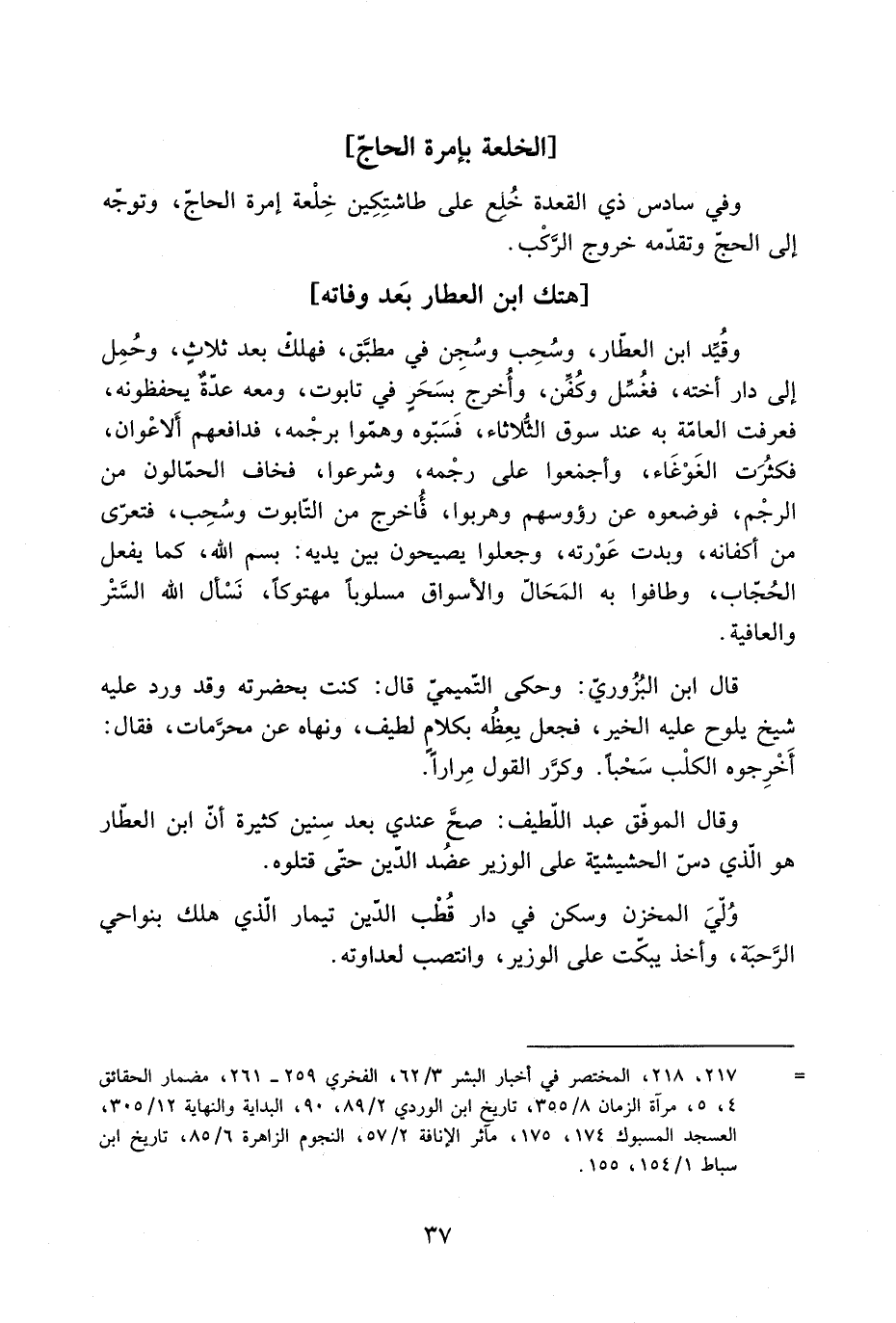وقُيد ابْن العطّار، وسُحِب وسُجِن فِي مطبّق، فهلك بعد ثلاثٍ، وحُمِل إلى دار أخته، فغُسَّل وكُفّن، وأخرج بسَحَر فِي تابوت، ومعه عدةٌ يحفظونه، فعرفت العامّة به عند سوق الثّلاثاء، فسبّوه وهمّوا برجمه، فدافعهم الأعْوان، فكثُرت الغَوغَاء، وأجمعوا على رجْمه، وشرعوا، فخاف الحمّالون من الرجْم، فوضعوه عَن رءوسهم وهربوا، فأخرج من التّابوت وسُحِب، فتعرّى من أكفانه، وبدت عَوْرته، وجعلوا يصيحون بين يديه: بسم اللَّه، كما يفعل الحُجاب، وطافوا به المحالّ والأسواق مسلوبا مهتوكا، نَسأل اللَّه السَّتْر والعافية.