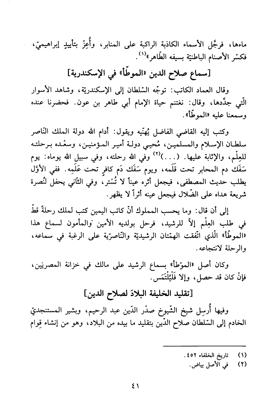 إلى أن قَالَ: وما يحسب المملوك أنّ كاتب اليمين كتب لملك رحلة قطّ فِي طلب العِلْم إلَّا للرشيد، فرحل بولديه الأمين والمأمون لسماع هذا «الموطّأ» الَّذِي اتّفقت الهمّتان الرشيديّة والنّاصريّة على الرغبة فِي سماعه، والرحلة لانتجاعه.