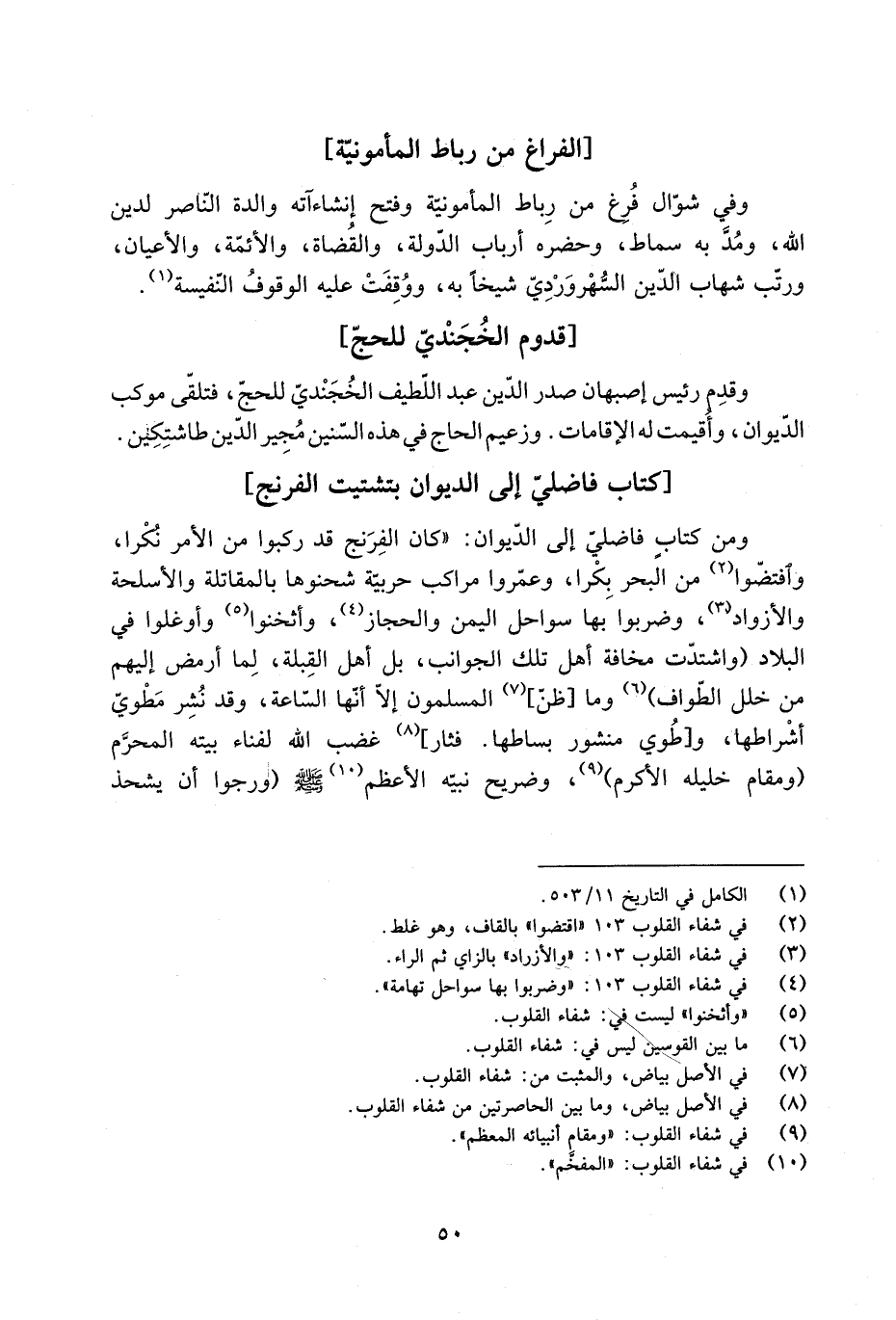 ومن كِتَاب فاضليّ إلى الدّيوان: «كان الفِرَنج قد ركبوا من الأمر نكْرا، وافتضّوا [2] من البحر بِكرا، وعمّروا مراكب حربيّة شحنوها بالمقاتلة والأسلحة والأزواد [3] ، وضربوا بها سواحل اليمن والحجاز [4] ، وأثخنوا [5] وأوغلوا فِي البلاد (واشتدّت مخافة أهل تلك الجوانب، بل أهل القِبلة، لما أرمض إليهم من خلل الطّواف) [6] وما [ظنّ] [7] المسلمون إلَّا أنّها السّاعة، وقد نُشِر مطويّ أشراطها، و [طوي منشور بساطها. فثار] [8] غضب اللَّه لفناء بيته المحرَّم (ومقام خليله الأكرم) [9] ، وضريح نبيّه الأعظم [10] صَلَّى اللَّه عَلَيْهِ وَسَلَّمَ (ورجوا أن يشحذ