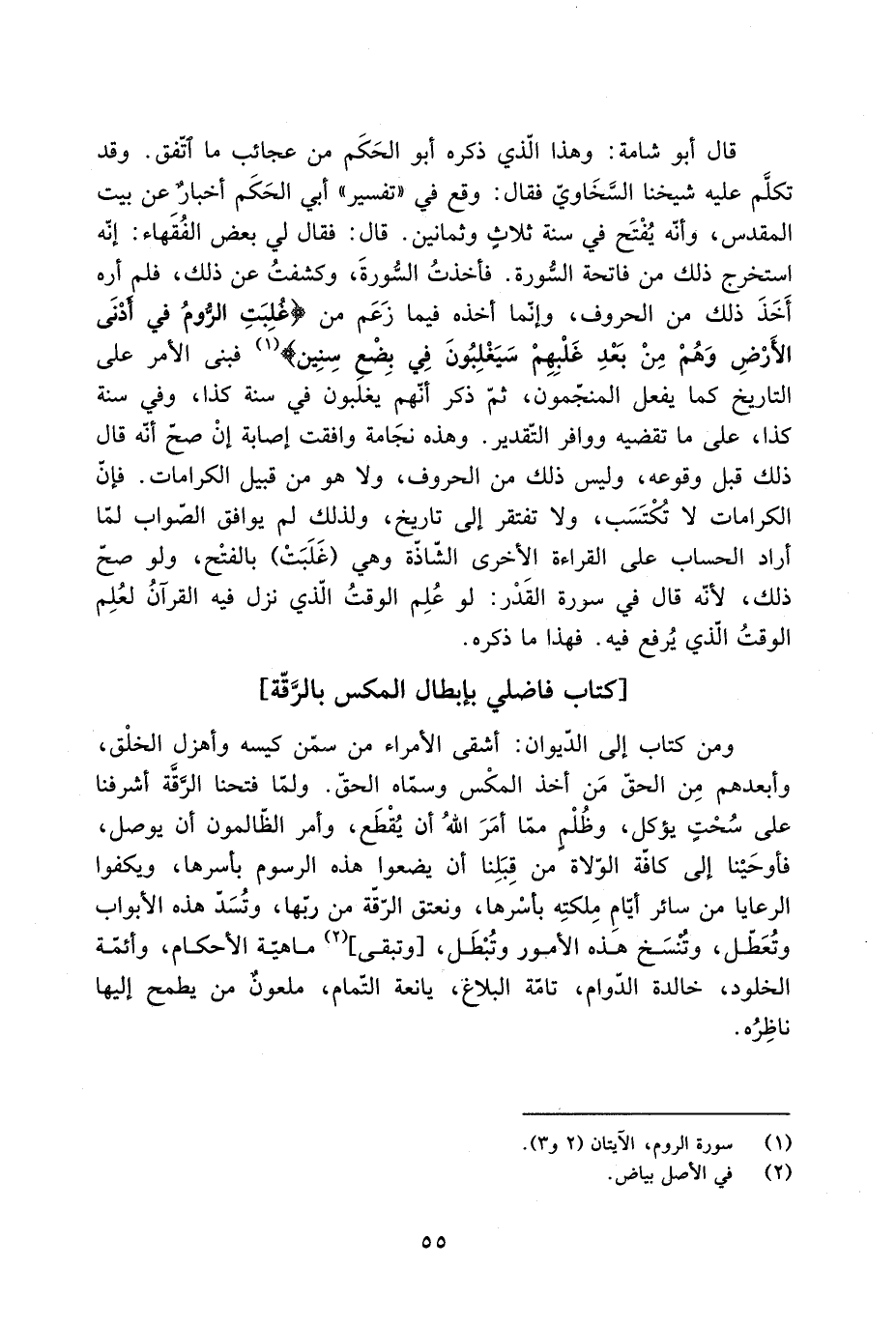 قال أَبُو شامة: وهذا الَّذِي ذكره أَبُو الحَكم من عجائب ما اتّفق. وقد تكلّم عَلَيْهِ شيخنا السخَاوي فقال: وقع فِي «تفسير» أَبِي الحَكَم أخبار عَن بيت المقدس، وأنّه يُفْتَح فِي سنة ثلاثٍ وثمانين. قال: فقال لي بعض الفُقهاء: إنّه استخرج ذلك من فاتحة السُورة. فأخذتُ السُورةَ، وكشفتُ عَن ذلك، فلم أره أخَذَ ذلك من الحروف، وإنّما أخذه فيما زَعَم من غُلِبَتِ الرُّومُ فِي أَدْنَى الْأَرْضِ وَهُمْ مِنْ بَعْدِ غَلَبِهِمْ سَيَغْلِبُونَ في بِضْعِ سِنِينَ 30: 2- 4 [1] فبنى الأمر على التاريخ كما يفعل المنجّمون، ثمّ ذكر أنّهم يغلبون فِي سنة كذا، وفي سنة كذا، على ما تقضيه ووافر التّقدير. وهذه نجامة وافقت إصابة إنْ صحّ أنّه قَالَ ذلك قبل وقوعه، وليس ذلك من الحروف، وَلَا هُوَ من قبيل الكرامات. فإنّ الكرامات لَا تُكْتَسَب، وَلَا تفتقر إلى تاريخ، ولذلك لم يوافق الصّواب لمّا أراد الحساب على القراءة الأخرى الشّاذّة وهي (غَلَبَتْ) بالفتْح، ولو صحّ ذلك، لأنّه قَالَ فِي سورة القَدْر: لو عُلِم الوقتُ الَّذِي نزل فِيهِ القرآنُ لعُلِم الوقتُ الَّذِي يُرفع فِيهِ. فهذا ما ذكره.