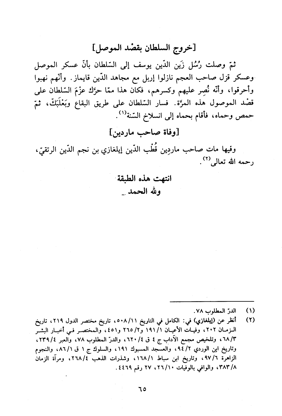 [2] انظر عن (إيلغازي) في: الكامل في التاريخ 11/ 508، تاريخ مختصر الدول 219، تاريخ الزمان 202، وفيات الأعيان 1/ 191 و 2/ 265 و 451، والمختصر في أخبار البشر 3/ 68، وتلخيص مجمع الآداب ج 4 ق 4/ 620، والدرّ المطلوب 78، والعبر 4/ 239، وتاريخ ابن الوردي 2/ 94، والعسجد المسبوك 191، والسلوك ج 1 ق 1/ 86، والنجوم الزاهرة 6/ 97، وتاريخ ابن سباط 1/ 168، وشذرات الذهب 4/ 268، ومرآة الزمان 8/ 383، والوافي بالوفيات 10/ 26، 27 رقم 4469.