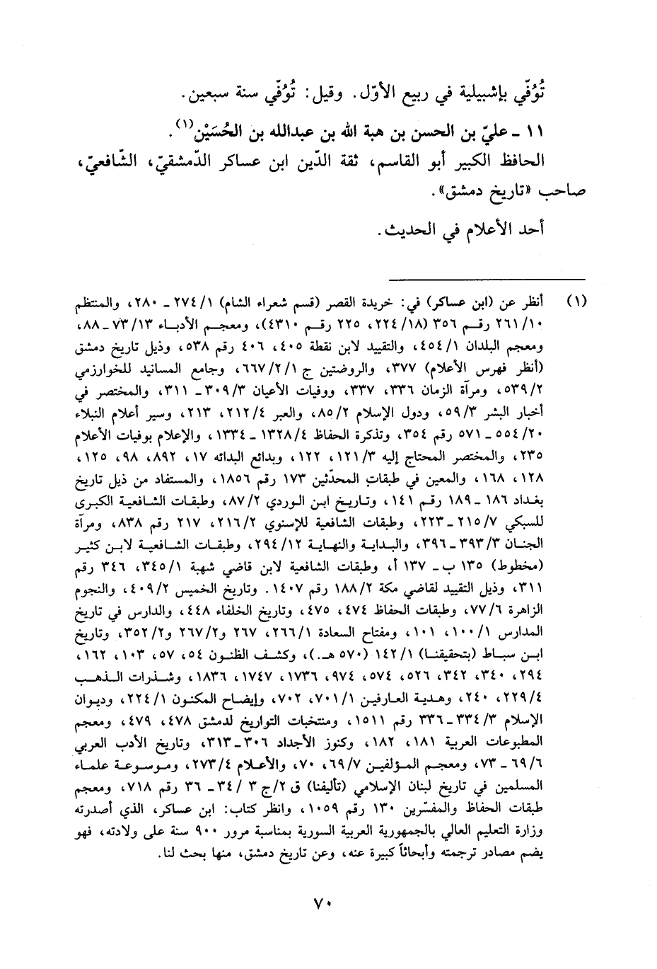 [1] انظر عن (ابن عساكر) في: خريدة القصر (قسم شعراء الشام) 1/ 274- 280، والمنتظم 10/ 261 رقم 356 (18/ 224، 225 رقم 4310) ، ومعجم الأدباء 13/ 73- 88، ومعجم البلدان 1/ 454، والتقييد لابن نقطة 405، 406 رقم 538، وذيل تاريخ دمشق (انظر فهرس الأعلام) 377، والروضتين ج 1/ 2/ 667، وجامع المسانيد للخوارزمي 2/ 539، ومرآة الزمان 336، 337، ووفيات الأعيان 3/ 309- 311، والمختصر في أخبار البشر 3/ 59، ودول الإسلام 2/ 85، والعبر 4/ 212، 213، وسير أعلام النبلاء 20/ 554- 571 رقم 354، وتذكرة الحفاظ 4/ 1328- 1334، والإعلام بوفيات الأعلام 235، والمختصر المحتاج إليه 3/ 121، 122، وبدائع البدائه 17، 892، 98، 125، 128، 168، والمعين في طبقات المحدّثين 173 رقم 1856، والمستفاد من ذيل تاريخ بغداد 186- 189 رقم 141، وتاريخ ابن الوردي 2/ 87، وطبقات الشافعية الكبرى للسبكي 7/ 215- 223، وطبقات الشافعية للإسنويّ 2/ 216، 217 رقم 838، ومرآة الجنان 3/ 393- 396، والبداية والنهاية 12/ 294، وطبقات الشافعية لابن كثير (مخطوط) 135 ب- 137 أ، وطبقات الشافعية لابن قاضي شهبة 1/ 345، 346 رقم 311، وذيل التقييد لقاضي مكة 2/ 188 رقم 1407. وتاريخ الخميس 2/ 409، والنجوم الزاهرة 6/ 77، وطبقات الحفاظ 474، 475، وتاريخ الخلفاء 448، والدارس في تاريخ المدارس 1/ 100، 101، ومفتاح السعادة 1/ 266، 267 و 2/ 267 و 2/ 352، وتاريخ ابن سباط (بتحقيقنا) 1/ 142 (570 هـ.) ، وكشف الظنون 54، 57، 103، 162، 294، 340، 342، 526، 574، 974، 1736، 1747، 1836، وشذرات الذهب 4/ 229، 240، وهدية العارفين 1/ 701، 702، وإيضاح المكنون 1/ 224، وديوان الإسلام 3/ 334- 336 رقم 1511، ومنتخبات التواريخ لدمشق 478، 479، ومعجم المطبوعات العربية 181، 182، وكنوز الأجداد 306- 313، وتاريخ الأدب العربيّ 6/ 69- 73، ومعجم المؤلفين 7/ 69، 70، والأعلام 4/ 273، وموسوعة علماء المسلمين في تاريخ لبنان الإسلامي (تأليفنا) ق 2/ ج 3/ 34- 36 رقم 718، ومعجم طبقات الحفاظ والمفسّرين 130 رقم 1059، وانظر كتاب: ابن عساكر، الّذي أصدرته وزارة التعليم العالي بالجمهورية العربية السورية بمناسبة مرور 900 سنة على ولادته، فهو يضم مصادر ترجمته وأبحاثا كبيرة عنه، وعن تاريخ دمشق، منها بحث لنا.