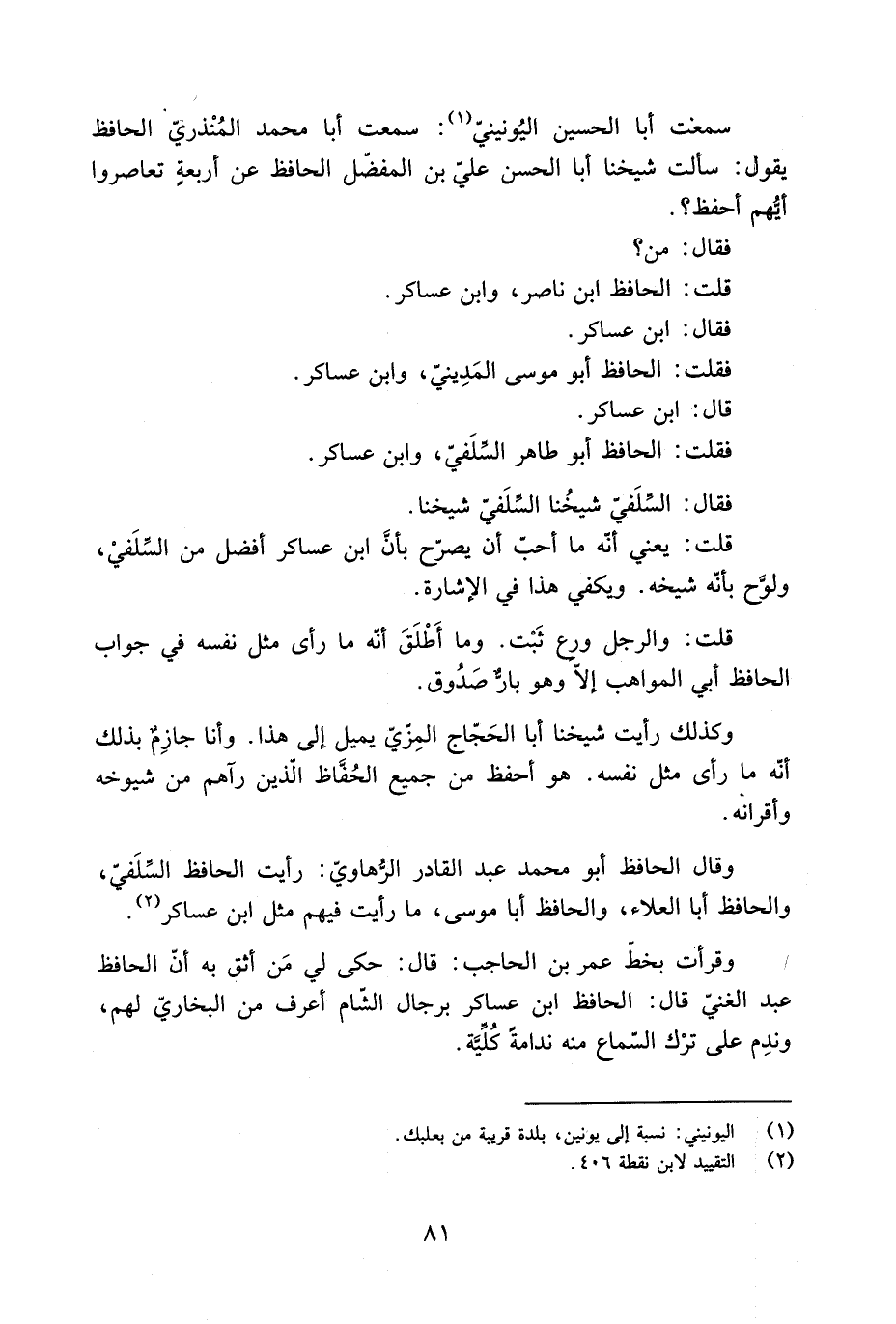 قلت: يعني أنّه ما أحبّ أن يصرّح بأنّ ابْن عساكر أفضل من السِّلَفيّ، ولوَّح بأنّه شيخه. ويكفي هذا في الإشارة.