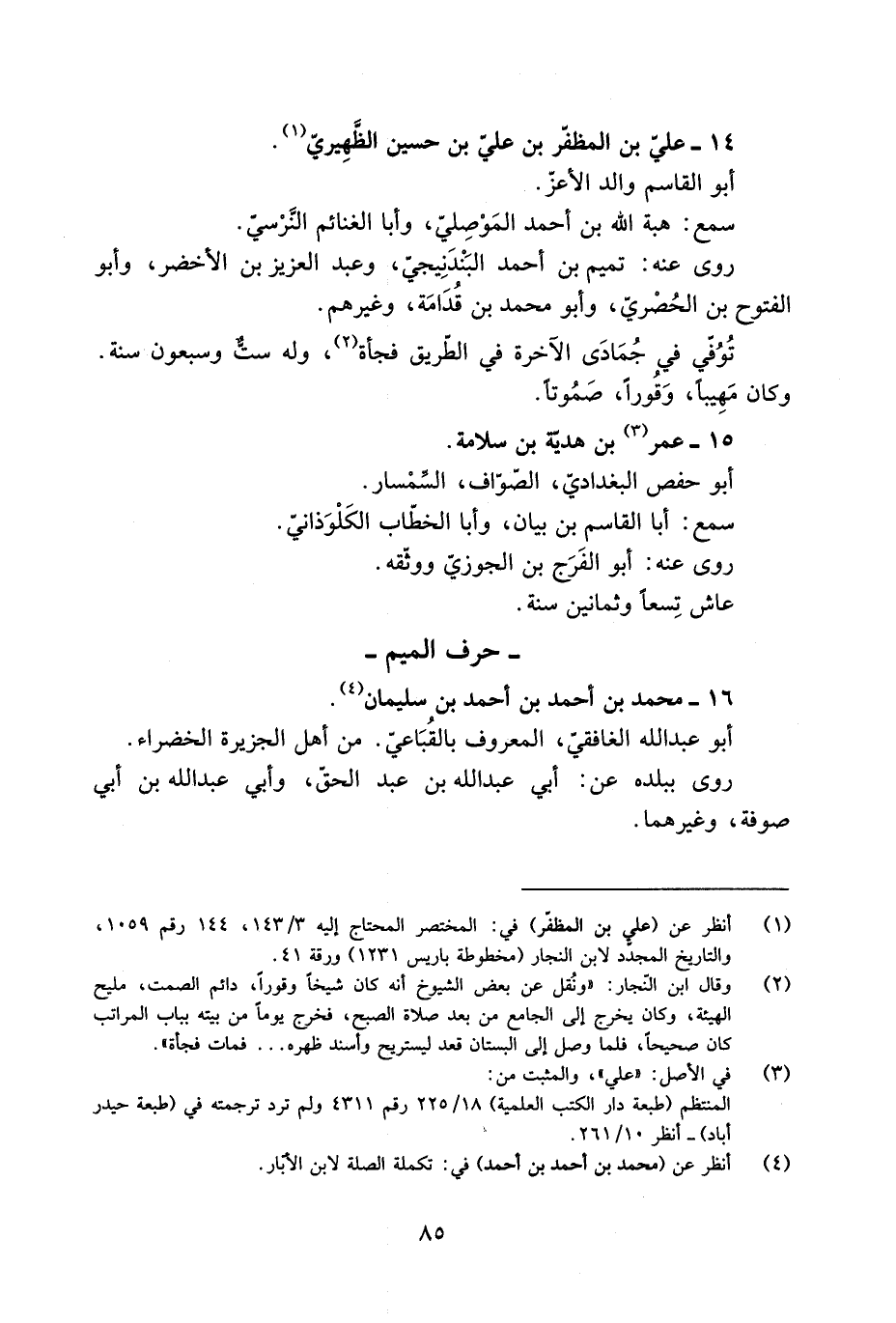 [1] انظر عن (علي بن المظفّر) في: المختصر المحتاج إليه 3/ 143، 144 رقم 1059، والتاريخ المجدّد لابن النجار (مخطوطة باريس 1231) ورقة 41.