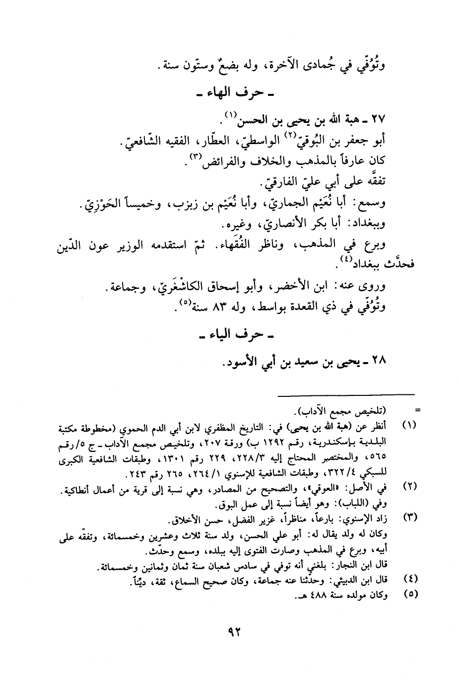 [1] انظر عن (هبة الله بن يحيى) في: التاريخ المظفري لابن أبي الدم الحموي (مخطوطة مكتبة البلدية بإسكندرية، رقم 1292 ب) ورقة 207، وتلخيص مجمع الآداب- ج 5/ رقم 565، والمختصر المحتاج إليه 3/ 228، 229 رقم 1301، وطبقات الشافعية الكبرى للسبكي 4/ 322، وطبقات الشافعية للإسنويّ 1/ 264، 265 رقم 243.