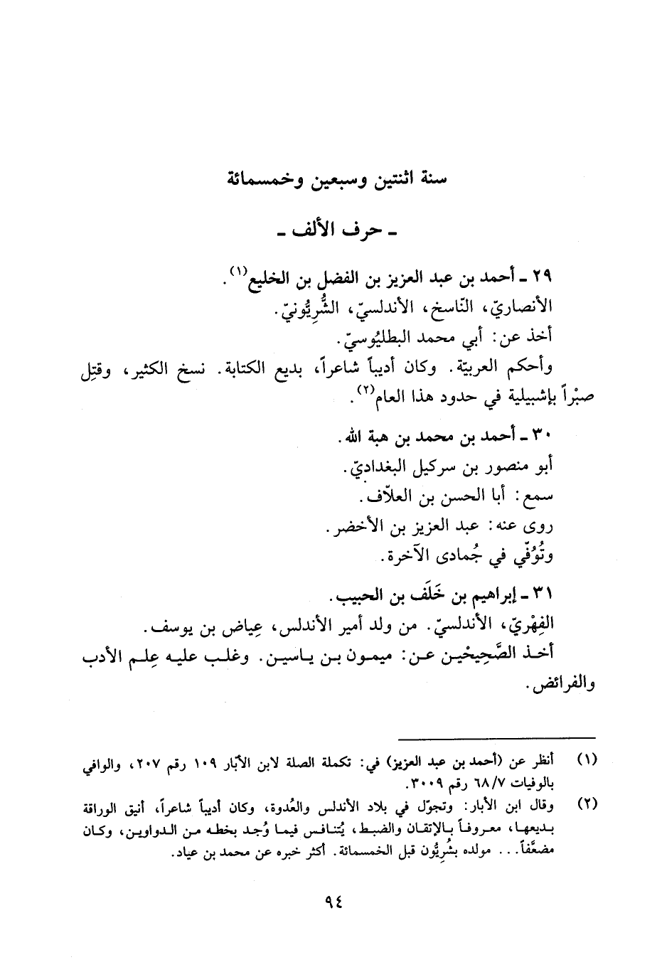 [1] انظر عن (أحمد بن عبد العزيز) في: تكملة الصلة لابن الأبّار 109 رقم 207، والوافي بالوفيات 7/ 68 رقم 3009.