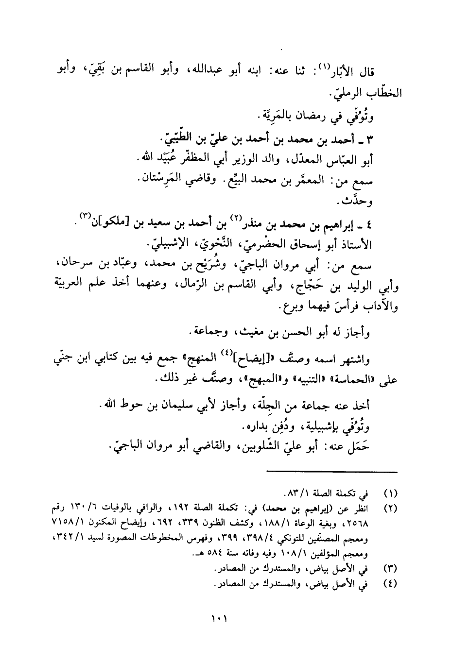 [2] انظر عن (إبراهيم بن محمد) في: تكملة الصلة 192، والوافي بالوفيات 6/ 130 رقم 2568، وبغية الوعاة 1/ 188، وكشف الظنون 339، 692، وإيضاح المكنون 1/ 7158 ومعجم المصنّفين للتونكي 4/ 398، 399، وفهرس المخطوطات المصورة لسيد 1/ 342، ومعجم المؤلفين 1/ 108 وفيه وفاته سنة 584 هـ.