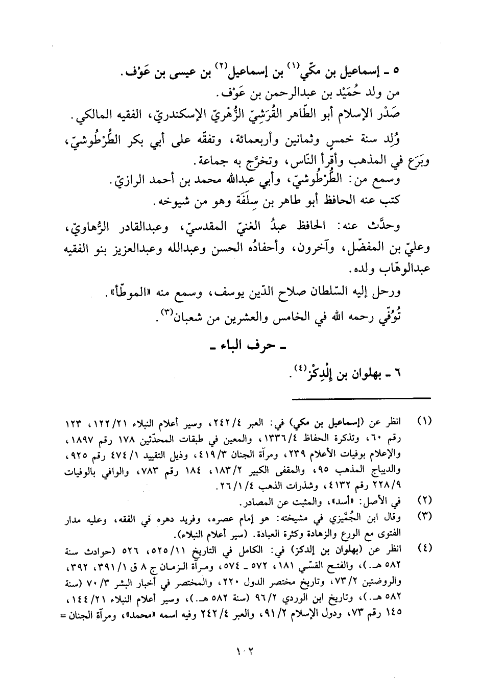 [1] انظر عن (إسماعيل بن مكي) في: العبر 4/ 242، وسير أعلام النبلاء 21/ 122، 123 رقم 60، وتذكرة الحفاظ 4/ 1336، والمعين في طبقات المحدّثين 178 رقم 1897، والإعلام بوفيات الأعلام 239، ومرآة الجنان 3/ 419، وذيل التقييد 1/ 474 رقم 925، والديباج المذهب 95، والمقفى الكبير 2/ 183، 184 رقم 783، والوافي بالوفيات 9/ 228 رقم 4132، وشذرات الذهب 4/ 1/ 26.