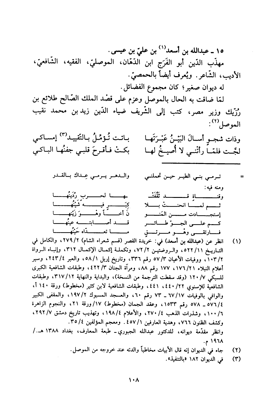 [1] انظر عن (عبد الله بن أسعد) في: خريدة القصر (قسم شعراء الشام) 2/ 279، والكامل في التاريخ 11/ 522، والروضتين 2/ 72، وتكملة إكمال الإكمال 312، وإنباه الرواة 2/ 103، ووفيات الأعيان 3/ 57 رقم 336، وتاريخ إربل 1/ 58، والعبر 4/ 243، وسير أعلام النبلاء 21/ 176، 177 رقم 88، ومرآة الجنان 3/ 422، وطبقات الشافعية الكبرى للسبكي 7/ 120 (وقد سقطت الترجمة من النسخة) ، والبداية والنهاية 12/ 317، وطبقات الشافعية للإسنويّ 22/ 440، 441، وطبقات الشافعية لابن كثير (مخطوط) ورقة 140 أ، والوافي بالوفيات 17/ 67- 73 رقم 60، والعسجد المسبوك 2/ 197، والمقفى الكبير 4/ 576- 578 رقم 1533، وعقد الجمان (مخطوط) 17/ ورقة 21، والنجوم الزاهرة 6/ 100، وشذرات الذهب 4/ 270، والأعلام 4/ 198، وتهذيب تاريخ دمشق 7/ 292، وكشف الظنون 766، وهدية العارفين 1/ 457. ومعجم المؤلفين 4/ 35.