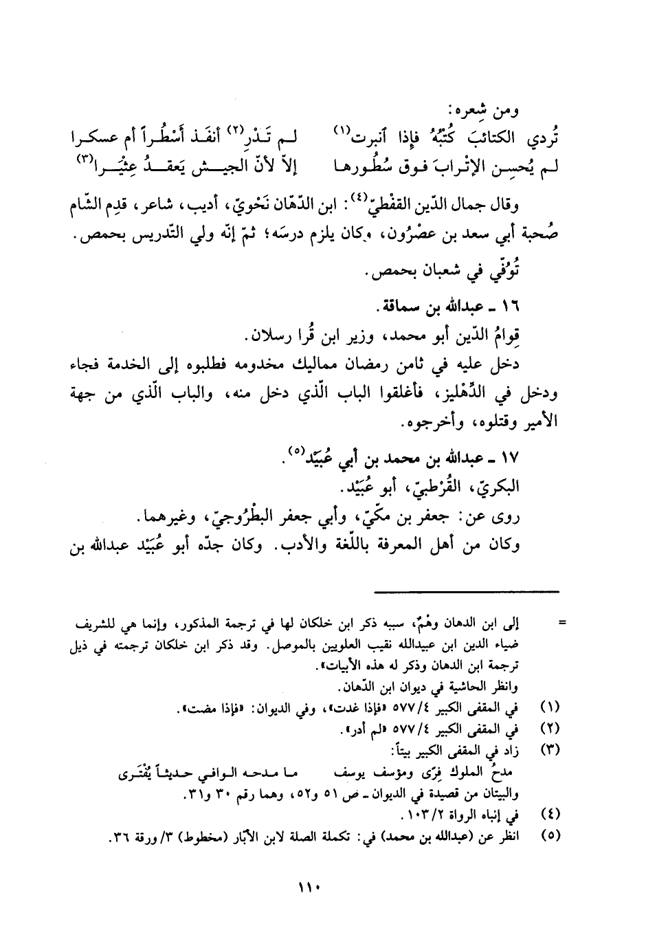 [ () ] إلى ابن الدهان وهم، سببه ذكر ابن خلكان لها في ترجمة المذكور، وإنما هي للشريف ضياء الدين ابن عبيد الله نقيب العلويين بالموصل. وقد ذكر ابن خلكان ترجمته في ذيل ترجمة ابن الدهان وذكر له هذه الأبيات» .