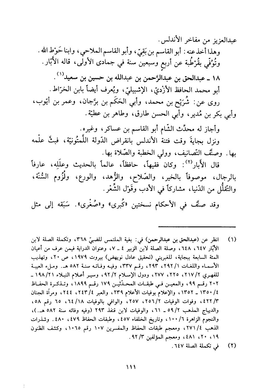 [1] انظر عن (عبد الحق بن عبد الرحمن) في: بغية الملتمس للضبيّ 368، وتكملة الصلة لابن الأبّار 647، 648، وصلة الصلة لابن الزبير 4- 7، وعنوان الدراية فيمن عرف من أعيان المائة السابعة ببجاية، للغبريني (تحقيق عادل نويهض) بيروت 1979، ص 20، وتهذيب الأسماء واللغات 1/ 292، 293، رقم 337، وفيه وفاته سنة 582 هـ. وملء العيبة للفهري 2/ 217، 225، 277، ودول الإسلام 2/ 92، وسير أعلام النبلاء 21/ 198- 202 رقم 99، والمعين في طبقات المحدّثين 179 رقم 1899، وتذكرة الحفاظ 4/ 1350- 1352، والإعلام بوفيات الأعلام 239، والعبر 4/ 243، 244، ومرآة الجنان 3/ 422، وفوات الوفيات 2/ 256، 257، والوافي بالوفيات 18/ 64، 65 رقم 58، والديباج المذهب 2/ 59- 61، والوفيات لابن قنفذ 293 (وفيه وفاته سنة 582 هـ.) ، والنجوم الزاهرة 6/ 100، وتاريخ الخلفاء 457، وطبقات الحفاظ 479، 480. وشذرات الذهب 4/ 271، ومعجم طبقات الحفاظ والمفسرين 107 رقم 1065، وكشف الظنون 19، 20، 481، ومعجم المؤلفين 3/ 92.