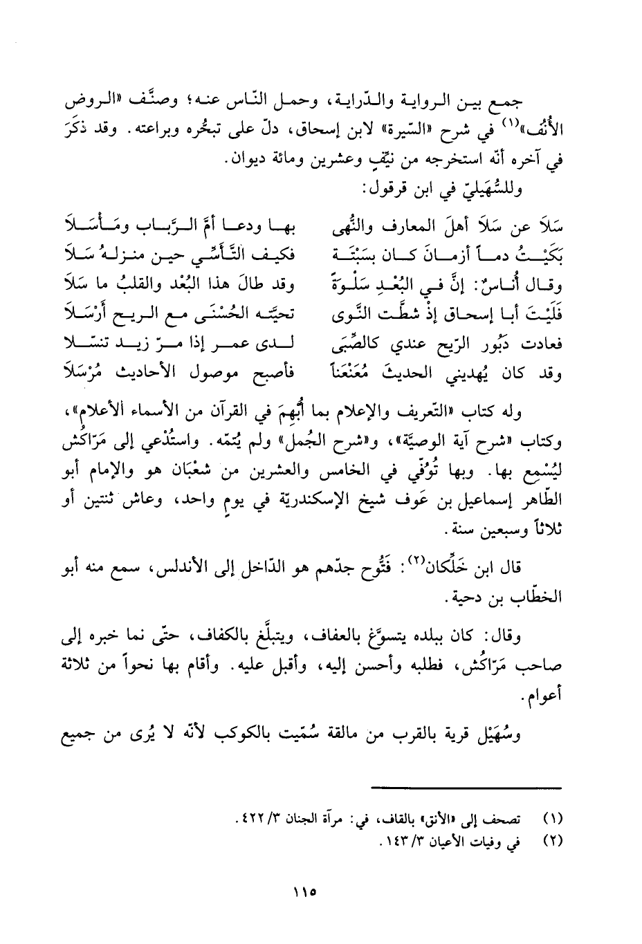 جمع بَيْنَ الرواية والدّراية، وحمل النّاس عَنْهُ، وصنَّف «الروض الأُنُف» [1] فِي شرح «السّيرة» لابن إِسْحَاق، دلّ عَلَى تبحُّره وبراعته. وَقَدْ ذكَرَ فِي آخره أَنَّهُ استخرجه من نيفٍ وعشرين ومائة ديوان.