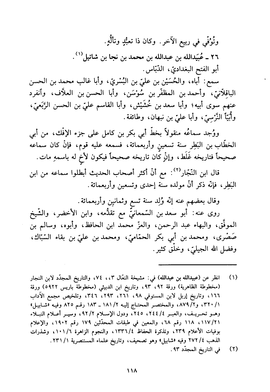 [1] انظر عن (عبيد الله بن عبد الله) في: مشيخة النعّال 3، 74، والتاريخ المجدّد لابن النجار (مخطوطة الظاهرية) ورقة 92، 93، وتاريخ ابن الدبيثي (مخطوطة باريس 5922) ورقة 166، وتاريخ إربل لابن المستوفي 98، 261، 293، 346، وتلخيص مجمع الآداب 1/ 320، و 2/ 879، والمختصر المحتاج إليه 2/ 181- 183 رقم 825 وفيه «شابيل» وهو تحريف، والعبر 4/ 244، 245، ودول الإسلام 2/ 92، وسير أعلام النبلاء 21/ 117، 118 رقم 68، والمعين في طبقات المحدّثين 179 رقم 1902، والإعلام بوفيات الأعلام 239، وتذكرة الحفاظ 4/ 1336، والنجوم الزاهرة 6/ 101، وشذرات الذهب 4/ 272 وفيه «شابيل» وهو تصحيف، وتاريخ علماء المستنصرية 1/ 231.