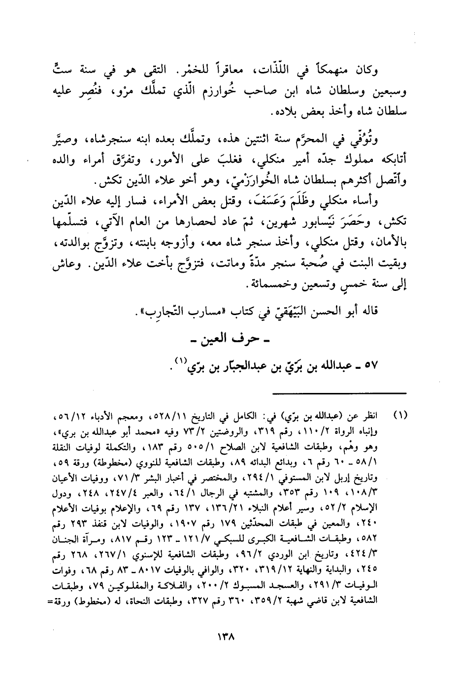 [1] انظر عن (عبد الله بن برّي) في: الكامل في التاريخ 11/ 528، ومعجم الأدباء 12/ 56، وإنباه الرواة 2/ 110، رقم 319، والروضتين 2/ 73 وفيه «محمد أبو عبد الله بن بري» ، وهو وهم، وطبقات الشافعية لابن الصلاح 1/ 505 رقم 183، والتكملة لوفيات النقلة 1/ 58- 60 رقم 6، وبدائع البدائه 89، وطبقات الشافعية للنووي (مخطوطة) ورقة 59، وتاريخ إربل لابن المستوفي 1/ 294، والمختصر في أخبار البشر 3/ 71، ووفيات الأعيان 3/ 108، 109 رقم 353، والمشتبه في الرجال 1/ 64، والعبر 4/ 247، 248، ودول الإسلام 2/ 52، وسير أعلام النبلاء 21/ 136، 137 رقم 69، والإعلام بوفيات الأعلام 240، والمعين في طبقات المحدّثين 179 رقم 1907، والوفيات لابن قنفذ 293 رقم 582، وطبقات الشافعية الكبرى للسبكي 7/ 121- 123 رقم 817، ومرآة الجنان 3/ 424، وتاريخ ابن الوردي 2/ 96، وطبقات الشافعية للإسنويّ 1/ 267، 268 رقم 245، والبداية والنهاية 12/ 319، 320، والوافي بالوفيات 8017- 83 رقم 68، وفوات الوفيات 3/ 291، والعسجد المسبوك 2/ 200، والفلاكة والمفلوكين 79، وطبقات الشافعية لابن قاضي شهبة 2/ 359، 360 رقم 327، وطبقات النحاة، له (مخطوط) ورقة