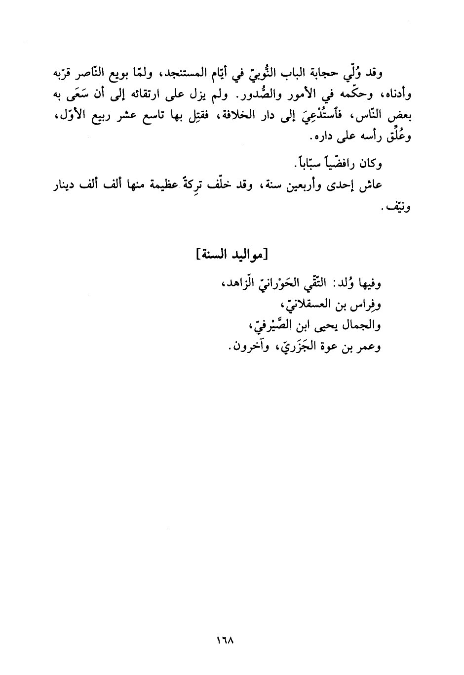 [مواليد السنة] وفيها وُلِد: التَّقِيّ الحَوْرانيّ الزّاهد، وفراس بن العسقلانيّ، والجمال يحيى ابن الصَّيْرفيّ، وعمر بْن عوة الْجَزَريّ، وآخرون.