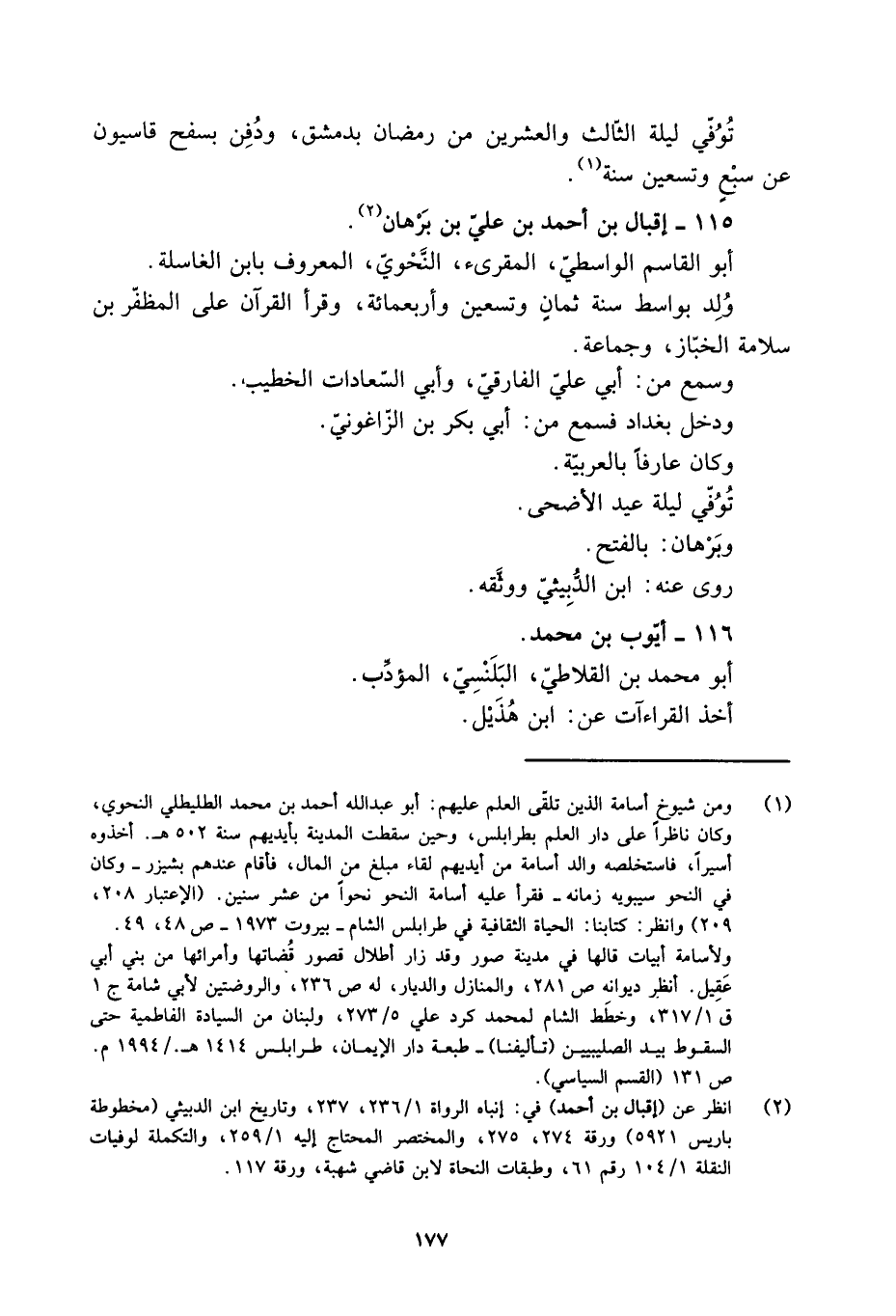 [2] انظر عن (إقبال بن أحمد) في: إنباه الرواة 1/ 236، 237، وتاريخ ابن الدبيثي (مخطوطة باريس 5921) ورقة 274، 275، والمختصر المحتاج إليه 1/ 259، والتكملة لوفيات النقلة 1/ 104 رقم 61، وطبقات النحاة لابن قاضي شهبة، ورقة 117.