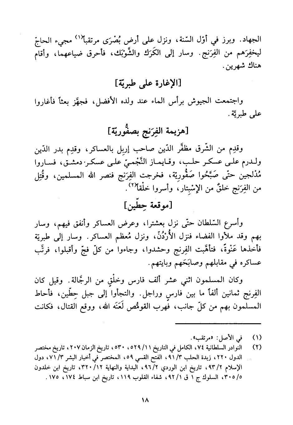 وأسرع السّلطان حَتَّى نزل بعشترا، وعرض العساكر وأنفق فيهم، وسار بهم وقد ملئوا الفضاء فنزل الأُرْدُنّ، ونزل مُعظم العساكر. وسار إلى طبريَّة فأخذها عَنْوةً، فتأهَّبت الفِرَنج وحشدوا، وجاءوا من كُلّ فجّ وأقبلوا، فرتَّب عساكره فِي مقابلهم وصابَحَهم وبايتهم.