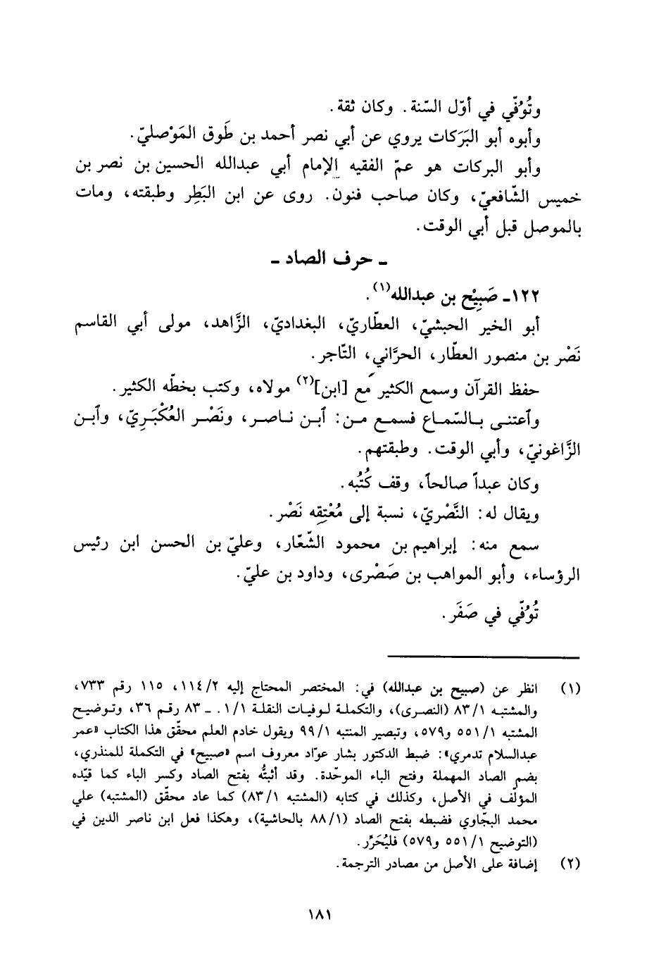 [1] انظر عن (صبيح بن عبد الله) في: المختصر المحتاج إليه 2/ 114، 115 رقم 733، والمشتبه 1/ 83 (النصري) ، والتكملة لوفيات النقلة 1/ 1.- 83 رقم 36، وتوضيح المشتبه 1/ 551 و 579، وتبصير المنتبه 1/ 99 ويقول خادم العلم محقّق هذا الكتاب «عمر عبد السلام تدمري» : ضبط الدكتور بشار عوّاد معروف اسم «صبيح» في التكملة للمنذري، بضم الصاد المهملة وفتح الباء الموحّدة. وقد أثبتّه بفتح الصاد وكسر الباء كما قيّده المؤلّف في الأصل، وكذلك في كتابه (المشتبه 1/ 83) كما عاد محقّق (المشتبه) علي محمد البجّاوي فضبطه بفتح الصاد (1/ 88 بالحاشية) ، وهكذا فعل ابن ناصر الدين في (التوضيح 1/ 551 و 579) فليحرّر.