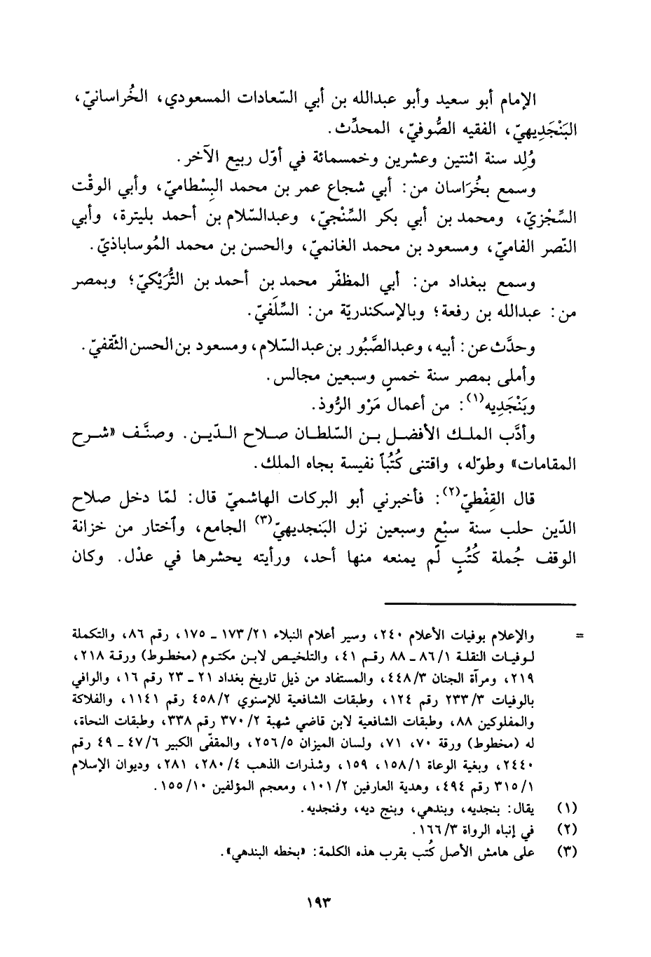 قَالَ القِفْطيّ [2] : فأخبرني أَبُو البركات الهاشميّ قَالَ: لمّا دخل صلاح الدّين حلب سنة سَبْعٍ وسبعين نزل البَنْجَدِيهيّ [3] الجامع، واختار من خزانة الوقف جُملة كُتُبٍ لَمْ يمنعه منها أحد، ورأيته يحشرها فِي عدْل. وكان