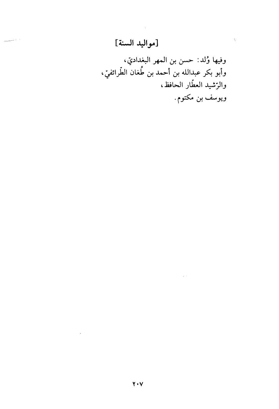 [مواليد السنة] وفيها وُلِد: حسن بْن المهر الْبَغْدَادِيّ، وأَبُو بَكْر عَبْد اللَّه بْن أَحْمَد بْن طُغان الطّرائفيّ، والرّشيد العَطَّار الحافظ، ويوسف بن مكتوم.