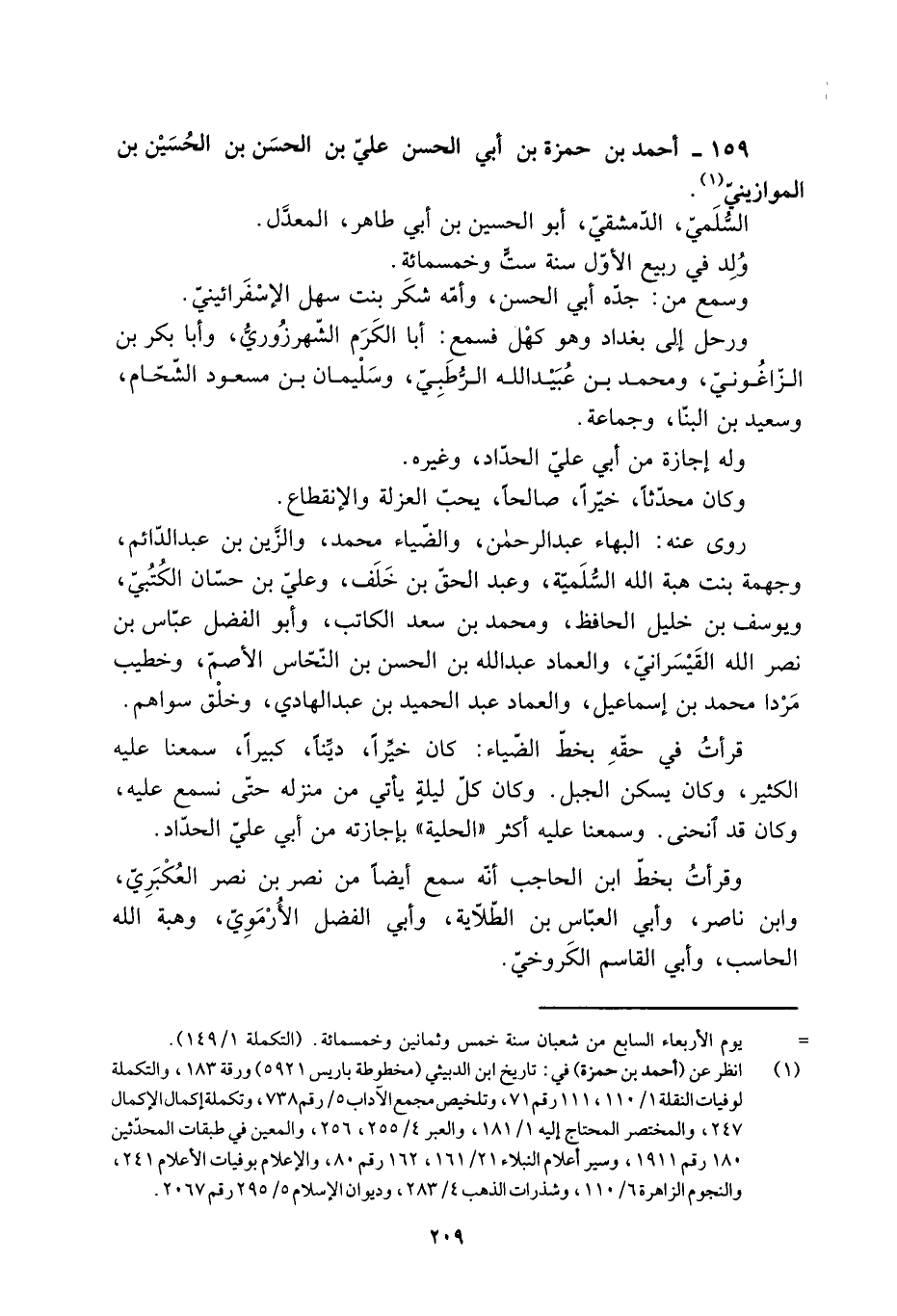 159- أَحْمَد بْن حَمْزَة بْن أبي الْحَسَن عَلِيّ بْن الْحَسَن بْن الْحُسَيْن بْن الموازينيّ [1] .