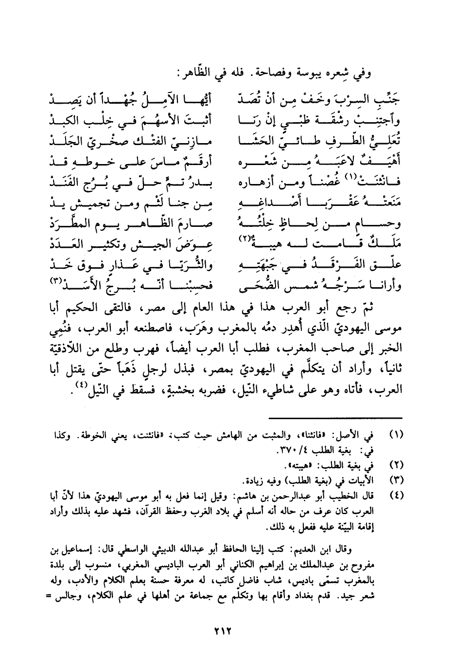 [3] ثُمَّ رجع أَبُو العرب هَذَا فِي هَذَا العام إلى مصر، فالتقى الحكيم أَبَا مُوسَى اليهوديّ الَّذِي أُهدِر دمُه بالمغرب وهَرَب، فاصطنعه أَبُو العرب، فنُمِي الخبر إلى صاحب المغرب، فطلب أَبَا العرب أيضا، فهرب وطلع منَ اللّاذقيَّة ثانيا، وأراد أن يتكلَّم فِي اليهوديّ بمصر، فبذل لرجلٍ ذَهَبًا حَتَّى يقتل أبا العرب، فأتاه وَهُوَ عَلَى شاطئ النّيل، فضربه بخشبةٍ، فسقط فِي النّيل [4] .