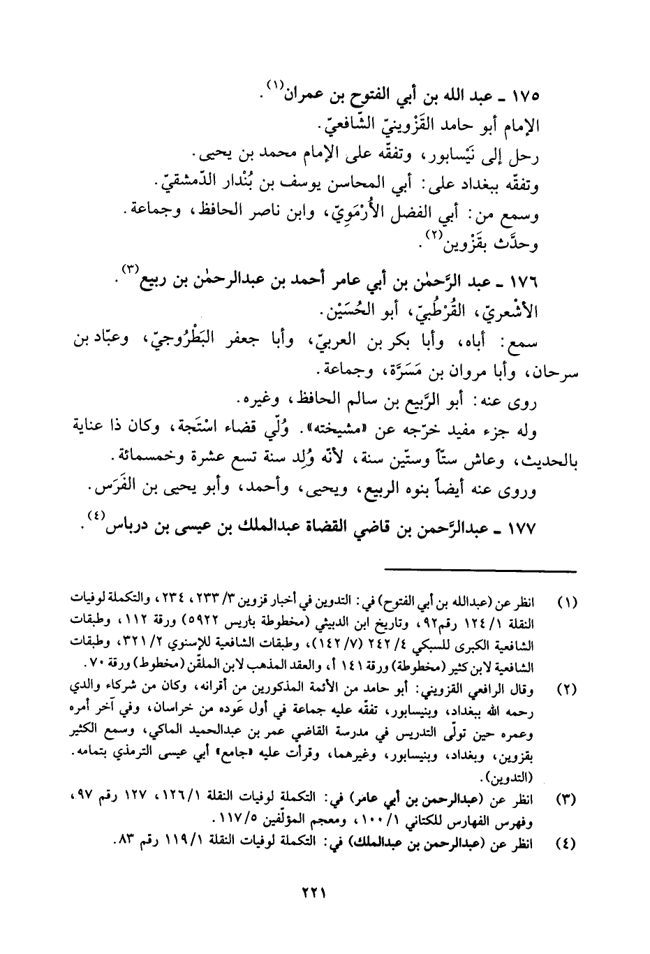 [1] انظر عن (عبد الله بن أبي الفتوح) في: التدوين في أخبار قزوين 3/ 233، 234، والتكملة لوفيات النقلة 1/ 124 رقم 92، وتاريخ ابن الدبيثي (مخطوطة باريس 5922) ورقة 112، وطبقات الشافعية الكبرى للسبكي 4/ 242 (7/ 142) ، وطبقات الشافعية للإسنويّ 2/ 321، وطبقات الشافعية لابن كثير (مخطوطة) ورقة 141 أ، والعقد المذهب لابن الملقّن (مخطوط) ورقة 70.