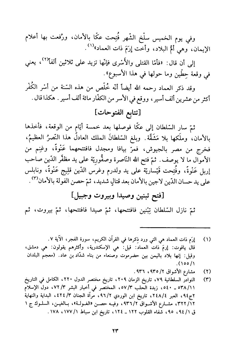 وَفِي يوم الخميس سلْخ الشّهر فُتِحت عكّا بالأمان، ورُفعت بها أعلام الْإِيمَان، وهي أمُّ البلاد، وأخت إرَمَ ذات العماد» [1] .