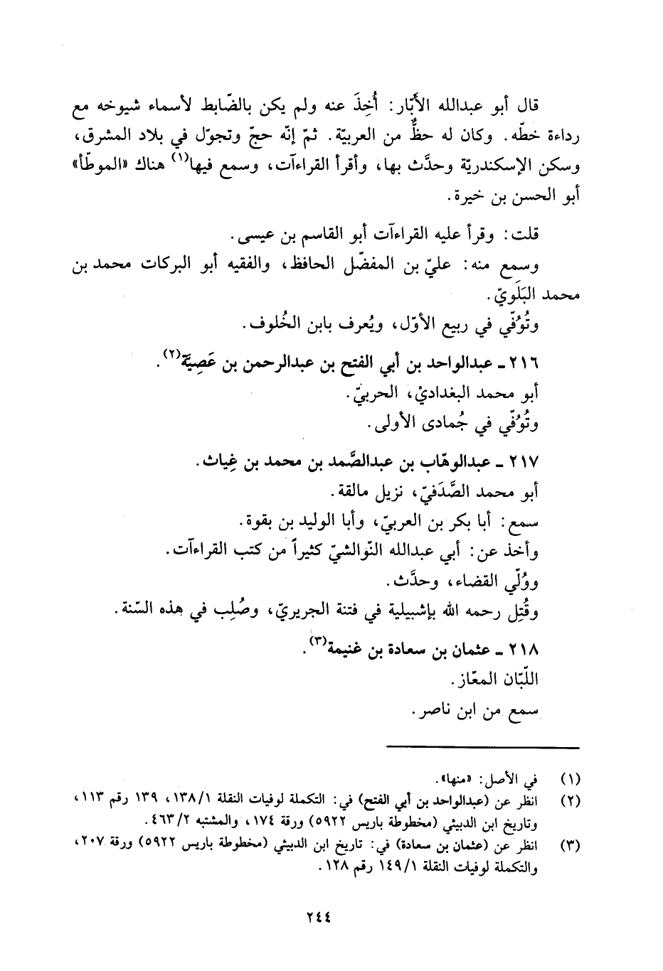 [3] انظر عن (عثمان بن سعادة) في: تاريخ ابن الدبيثي (مخطوطة باريس 5922) ورقة 207، والتكملة لوفيات النقلة 1/ 149 رقم 128.