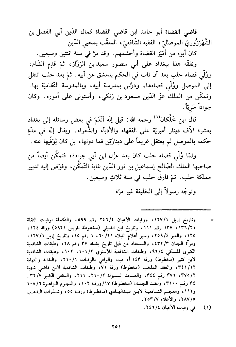 [ () ] وتاريخ إربل 1/ 127، ووفيات الأعيان 4/ 246 رقم 599، والتكملة لوفيات النقلة 21/ 136، 137 رقم 111، وتاريخ ابن الدبيثي (مخطوطة باريس 5921) ورقة 124، 125، والعبر 4/ 259، وسير أعلام النبلاء 21/ 60، 1 رقم 15، وتاريخ إربل 1/ 127، ومرآة الجنان 3/ 432، والمستفاد من ذيل تاريخ بغداد 37 رقم 28، وطبقات الشافعية الكبرى للسبكي 4/ 96، وطبقات الشافعية للأسنوي 2/ 101، 102، وطبقات الشافعية لابن كثير (مخطوط) ورقة 143 أ، ب، والوافي بالوفيات 1/ 210، والبداية والنهاية 12/ 341، والعقد المذهب (مخطوط) ورقة 71، وطبقات الشافعية لابن قاضي شهبة 2/ 375، 376 رقم 344، والعسجد المسبوك 2/ 210، 211، والمقفى الكبير 7/ 32- 34 رقم 3100، وعقد الجمان (مخطوط) 17/ ورقة 102، والنجوم الزاهرة 6/ 108 و 112، ومعجم الشافعية لابن عبد الهادي (مخطوط) ورقة 55، وشذرات الذهب 5/ 287، والأعلام 7/ 253.