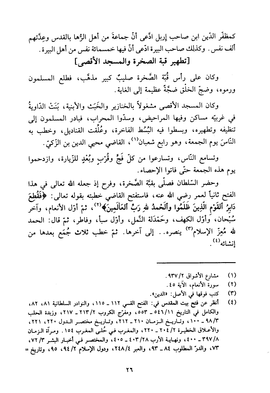 [4] انظر عن فتح بيت المقدس في: الفتح القسي 112- 115، والنوادر السلطانية 81، 82، والكامل في التاريخ 11/ 546- 553، ومفرّج الكروب 2/ 213- 217، وزبدة الحلب 3/ 98- 100، وتاريخ الزمان 210- 212، وتاريخ مختصر الدول 220، 221، والأعلاق الخطيرة 2/ 204- 220، والمغرب في حلى المغرب 154. ومرآة الزمان 8/ 397- 400، ونهاية الأرب 28/ 403- 405، والمختصر في أخبار البشر 3/ 72، 73، والدرّ المطلوب 84- 93، والعبر 4/ 248، ودول الإسلام 2/ 94، 95، وتاريخ