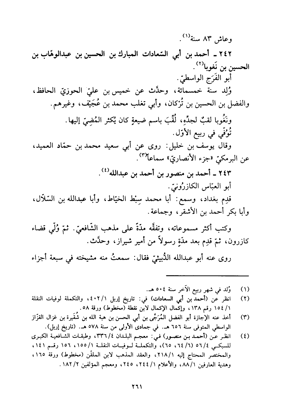 [2] انظر عن (أحمد بن أبي السعادات) في: تاريخ إربل 1/ 402، والتكملة لوفيات النقلة 1/ 154 رقم 138، وإكمال الإكمال لابن نقطة (مخطوط) ورقة 58.