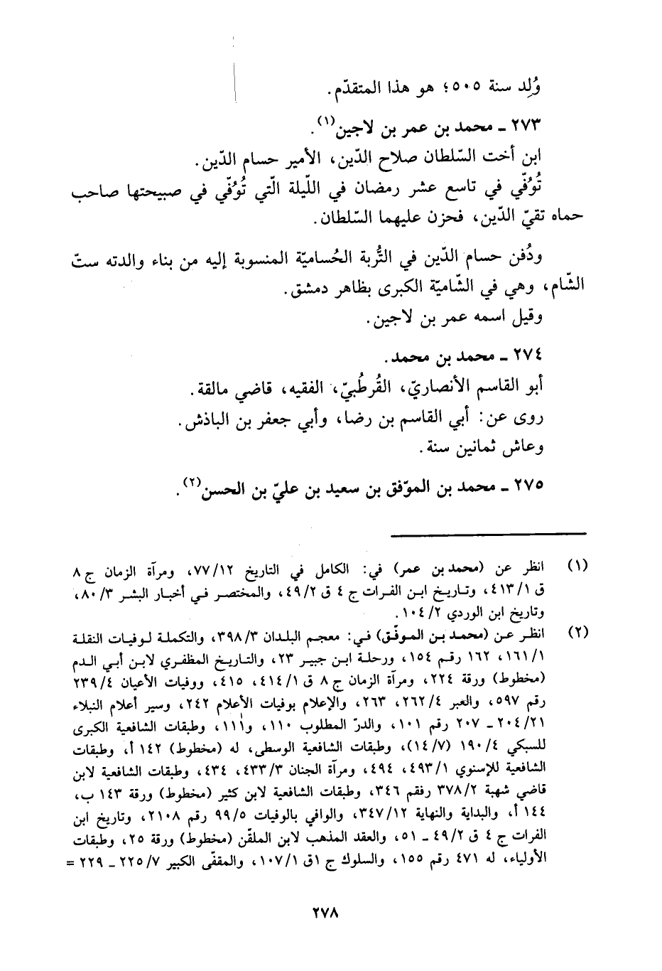 [2] انظر عن (محمد بن الموفّق) في: معجم البلدان 3/ 398، والتكملة لوفيات النقلة 1/ 161، 162 رقم 154، ورحلة ابن جبير 23، والتاريخ المظفري لابن أبي الدم (مخطوط) ورقة 224، ومرآة الزمان ج 8 ق 1/ 414، 415، ووفيات الأعيان 4/ 239 رقم 597، والعبر 4/ 262، 263، والإعلام بوفيات الأعلام 242، وسير أعلام النبلاء 21/ 204- 207 رقم 101، والدرّ المطلوب 110، و 111، وطبقات الشافعية الكبرى للسبكي 4/ 190 (7/ 14) ، وطبقات الشافعية الوسطى، له (مخطوط) 142 أ، وطبقات الشافعية للإسنويّ 1/ 493، 494، ومرآة الجنان 3/ 433، 434، وطبقات الشافعية لابن قاضي شهبة 2/ 378 رقم 346، وطبقات الشافعية لابن كثير (مخطوط) ورقة 143 ب، 144 أ، والبداية والنهاية 12/ 347، والوافي بالوفيات 5/ 99 رقم 2108، وتاريخ ابن الفرات ج 4 ق 2/ 49- 51، والعقد المذهب لابن الملقّن (مخطوط) ورقة 25، وطبقات الأولياء، له 471 رقم 155، والسلوك ج 1 ق 1/ 107، والمقفّى الكبير 7/ 225- 229