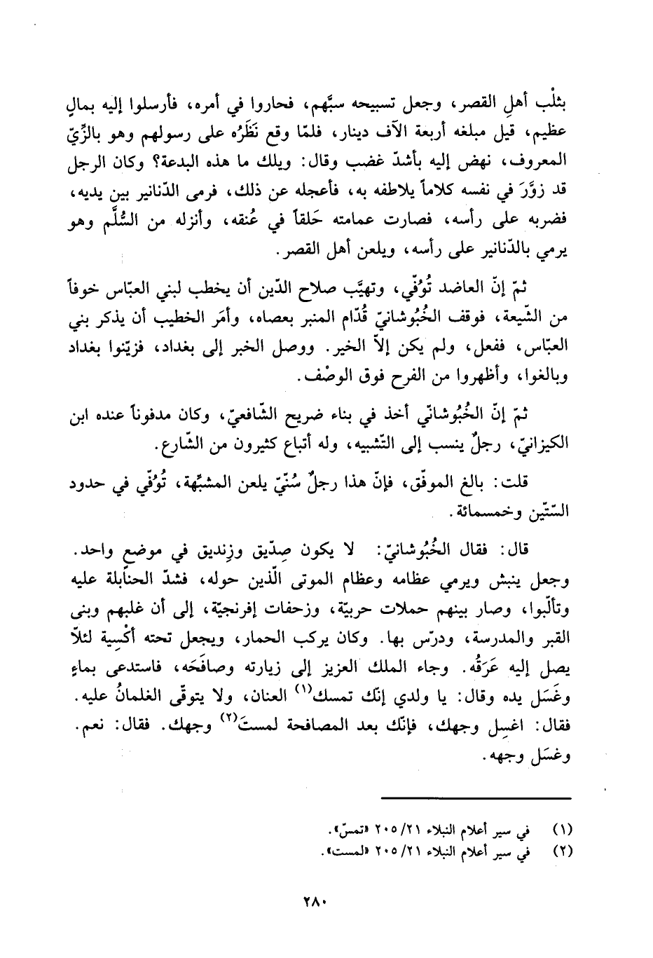 بثلْب أهلِ القصر، وَجَعَل تسبيحه سبَّهم، فحاروا فِي أمره، فأرسلوا إِلَيْهِ بمالٍ عظيم، قِيلَ مبلغه أربعة آلاف دينار، فَلَمَّا وقع نَظَرُه عَلَى رسولهم وَهُوَ بالزِّيّ المعروف، نهض إِلَيْهِ بأشدّ غضب وقَالَ: ويلك ما هَذِهِ البدعة؟ وكان الرجل قد زوّر في نفسه كاملا يلاطفه بِهِ، فأعجله عَنْ ذَلِكَ، فرمى الدّنانير بَيْنَ يديه، فضربه عَلَى رأسه، فصارت عمامته حَلقًا فِي عُنقه، وأنزله منَ السُّلَّم وَهُوَ يرمي بالدّنانير عَلَى رأسه، ويلعن أَهْل القصر.