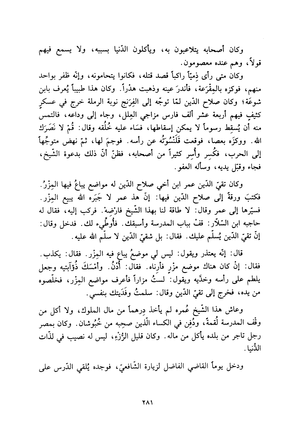 فَقَالَ: إنْ كَانَ هناك موضع مزْرٍ فأرِناه. فَقَالَ: أُدْنُ. وأمْسَكَ ذُؤابتيه وَجَعَل يلطم عَلَى رأسه وخدَّيه ويقول: لستُ مزارا فأعرف مواضع المِزْر، فخلّصوه من يده، فخرج إلى تقيّ الدّين وقال: سلمت وفديتك بنفسي.