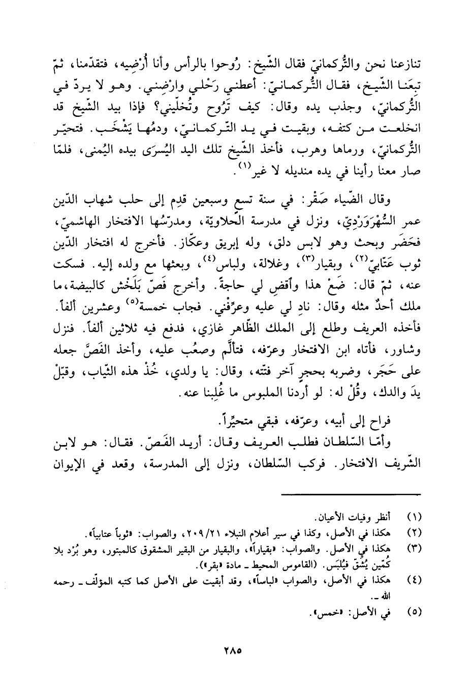 وقَالَ الضّياء صَقْر: فِي سنة تسعٍ وسبعين قدِم إلى حلب شهاب الدّين عُمَر السَّهْرُوَرْديّ، ونزل فِي مدرسة الحلاويَّة، ومدرسُها الافتخار الهاشميّ، فحَضَر وبحث وَهُوَ لابس دلق، وَلَهُ إبريق وعكّاز. فأخرج لَهُ افتخار الدّين ثوب عتّابيّ [2] ، وبقيار [3] ، وغلالة، ولباس [4] ، وبعثها مَعَ ولده إِلَيْهِ. فسكت عَنْهُ، ثُمَّ قَالَ: ضَعْ هَذَا واقضِ لي حاجة. وأخرج فَصّ بَلَخْش كالبيضة، ما ملك أحدٌ مثله وقَالَ: نادِ لي عليه وعرِّفْني. فجاب خمسة [5] وعشرين ألفا.