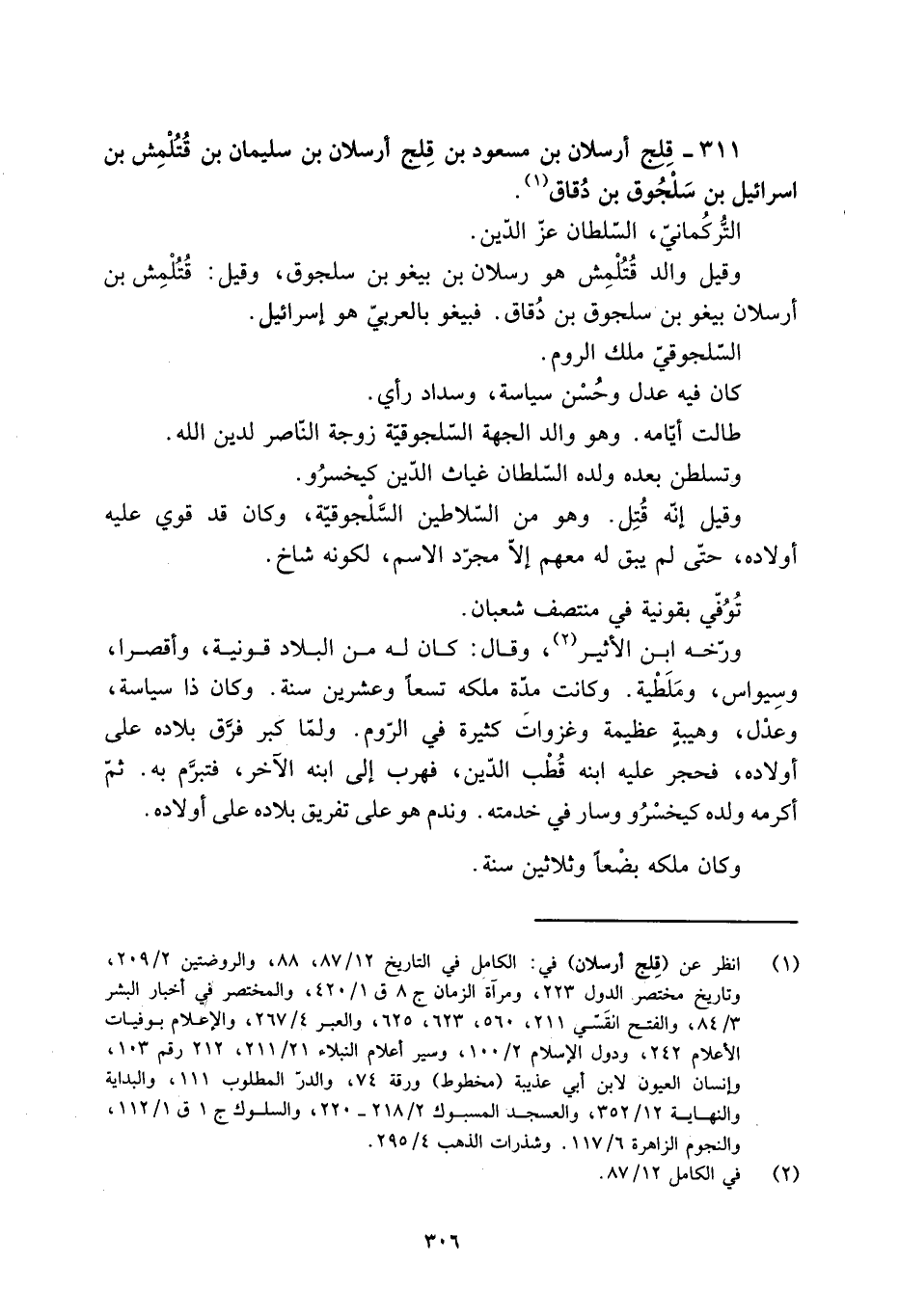 [1] انظر عن (قلج أرسلان) في: الكامل في التاريخ 12/ 87، 88، والروضتين 2/ 209، وتاريخ مختصر الدول 223، ومرآة الزمان ج 8 ق 1/ 420، والمختصر في أخبار البشر 3/ 84، والفتح القسّي 211، 560، 623، 625، والعبر 4/ 267، والإعلام بوفيات الأعلام 242، ودول الإسلام 2/ 100، وسير أعلام النبلاء 21/ 211، 212 رقم 103، وإنسان العيون لابن أبي عذيبة (مخطوط) ورقة 74، والدرّ المطلوب 111، والبداية والنهاية 12/ 352، والعسجد المسبوك 2/ 218- 220، والسلوك ج 1 ق 1/ 112، والنجوم الزاهرة 6/ 117. وشذرات الذهب 4/ 295.