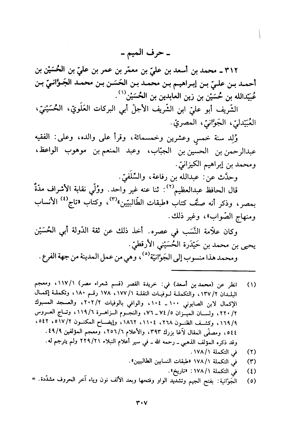 312- مُحَمَّد بْن أسعد بْن عَلِيّ بْن معمّر بْن عُمَر بْن عَلِيّ بْن الْحُسَيْن بْن أَحْمَد بْن عَلِيّ بْن إِبْرَاهِيم بْن مُحَمَّد بْن الْحَسَن بْن مُحَمَّد الْجَوَّانيّ بْن عُبَيْد اللَّه بْن حُسَيْن بْن زين العابدين بْن الْحُسَيْن [1] .