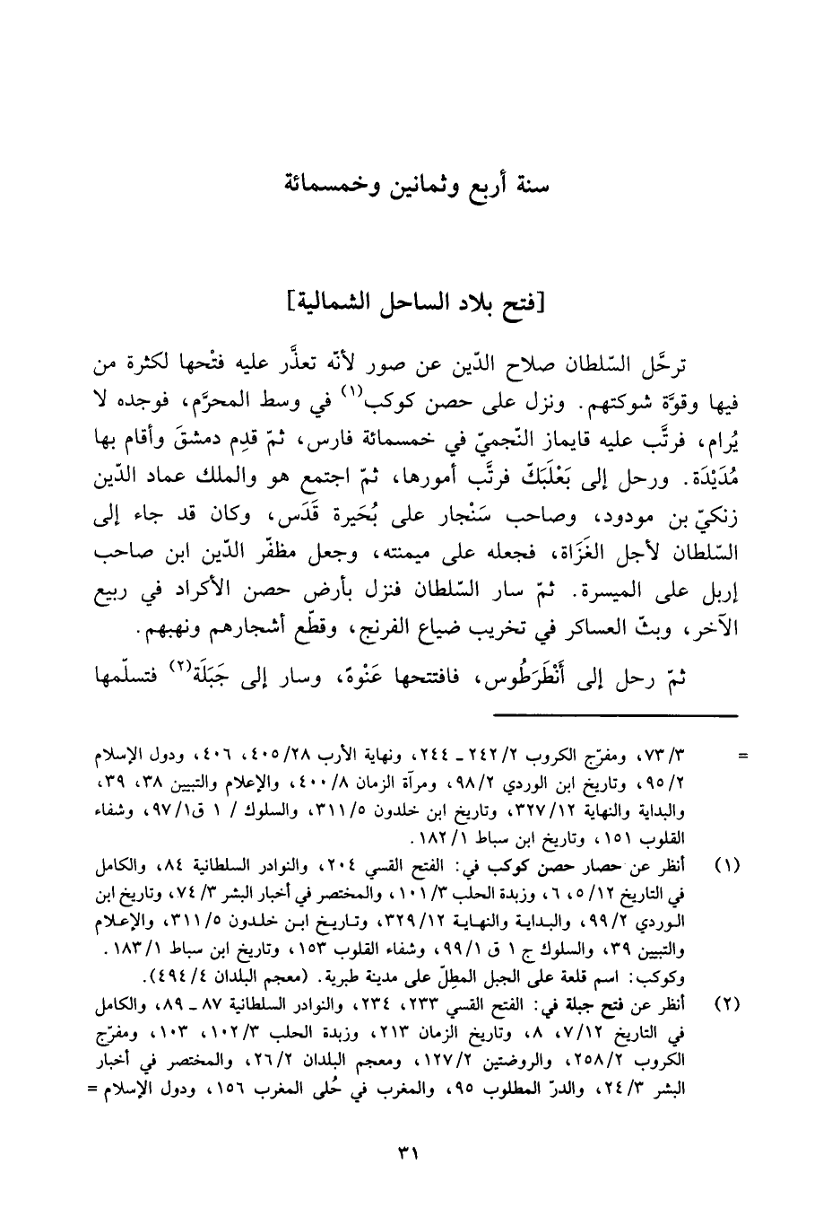 [2] انظر عن فتح جبلة في: الفتح القسي 233، 234، والنوادر السلطانية 87- 89، والكامل في التاريخ 12/ 7، 8، وتاريخ الزمان 213، وزبدة الحلب 3/ 102، 103، ومفرّج الكروب 2/ 258، والروضتين 2/ 127، ومعجم البلدان 2/ 26، والمختصر في أخبار البشر 3/ 24، والدرّ المطلوب 95، والمغرب في حلى المغرب 156، ودول الإسلام