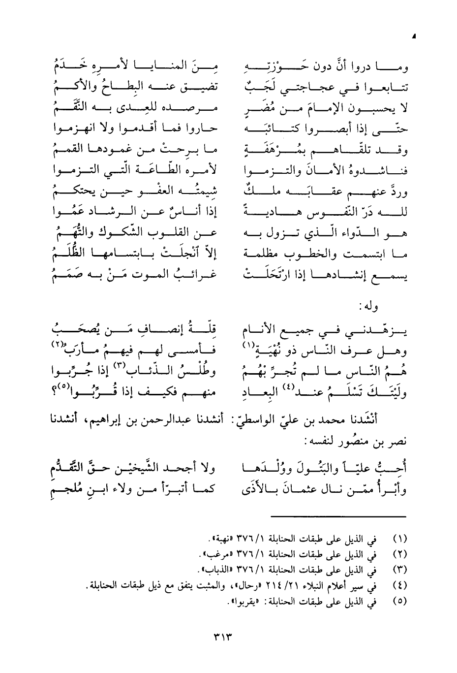 أنْشَدنا مُحَمَّد بْن عَلِيّ الواسطيّ: أنشدنا عَبْد الرَّحْمَن بْن إِبْرَاهِيم، أنشدنا نصر بْن مَنْصُور لنفسه: