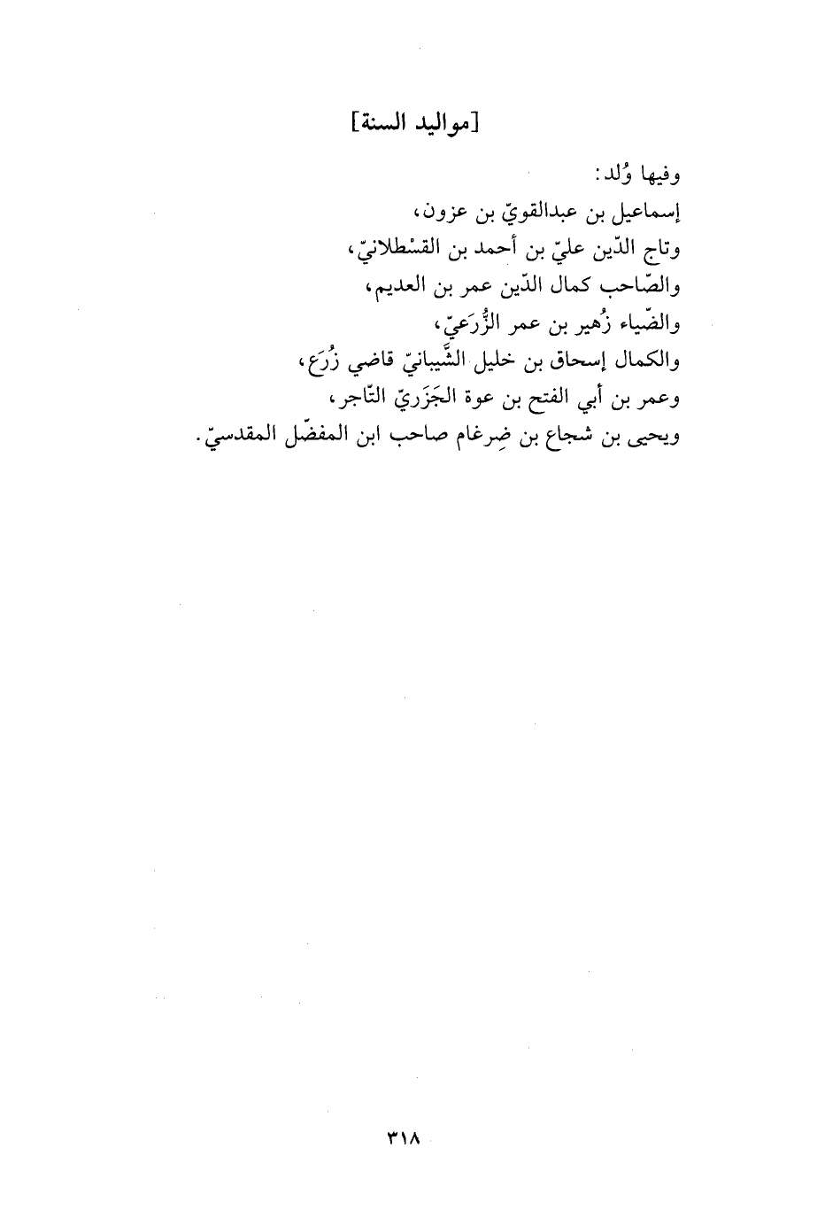 إِسْمَاعِيل بْن عَبْد القويّ بْن عزون، وتاج الدّين عَلِيّ بْن أحمد بن القسطلانيّ، والصّاحب كمال الدّين عُمَر بْن العديم، والضّياء زُهير بْن عُمَر الزُّرَعيّ، والكمال إِسْحَاق بْن خليل الشَّيْبَانِيّ قاضي زُرَع، وعمر بْن أَبِي الفتح بْن عوة الْجَزَريّ التّاجر، ويحيى بْن شجاع بن ضرغام صاحب ابن المفضّل المَقْدسيّ.