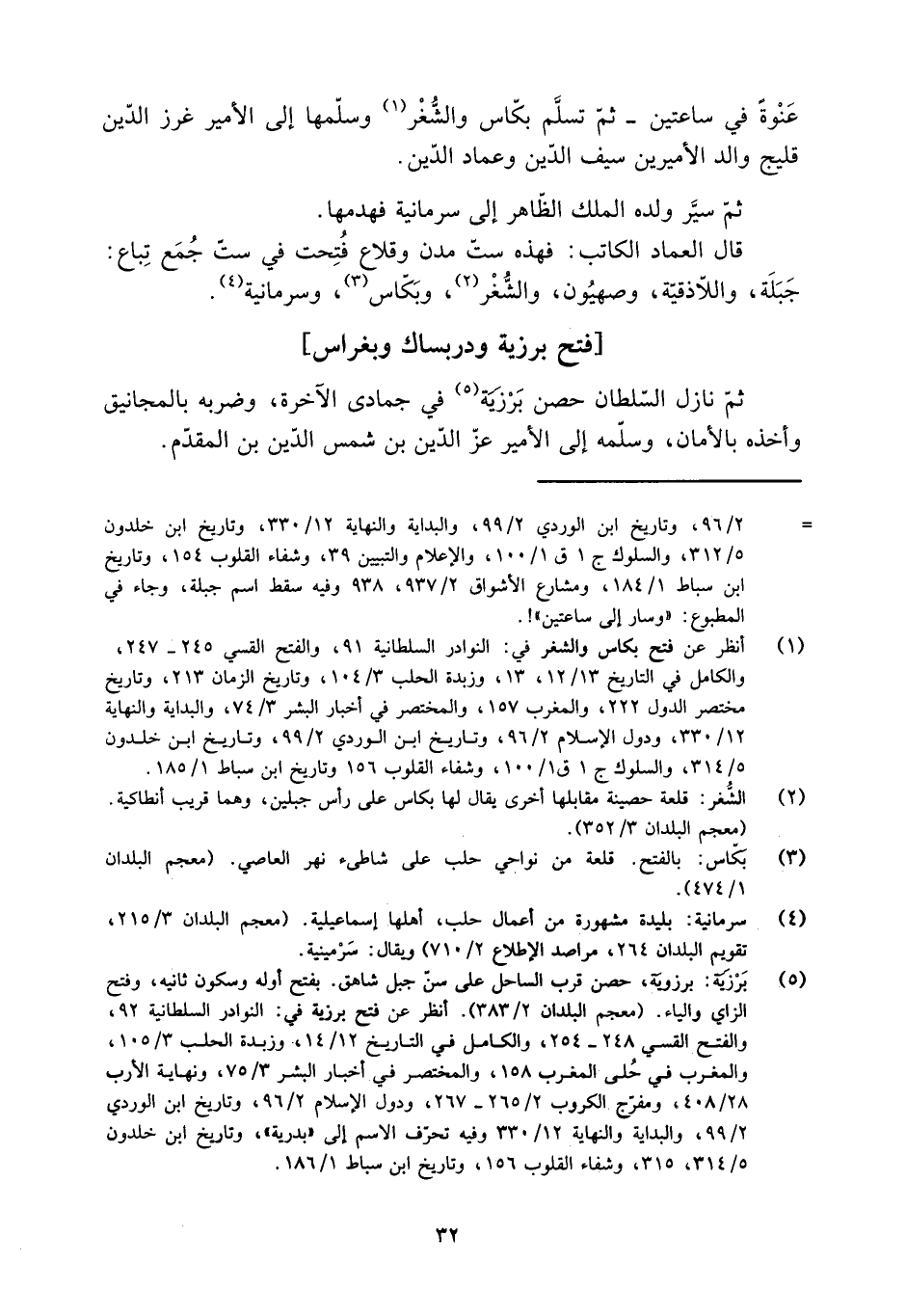 [1] انظر عن فتح بكاس والشغر في: النوادر السلطانية 91، والفتح القسي 245- 247، والكامل في التاريخ 13/ 12، 13، وزبدة الحلب 3/ 104، وتاريخ الزمان 213، وتاريخ مختصر الدول 222، والمغرب 157، والمختصر في أخبار البشر 3/ 74، والبداية والنهاية 12/ 330، ودول الإسلام 2/ 96، وتاريخ ابن الوردي 2/ 99، وتاريخ ابن خلدون 5/ 314، والسلوك ج 1 ق 1/ 100، وشفاء القلوب 156 وتاريخ ابن سباط 1/ 185.